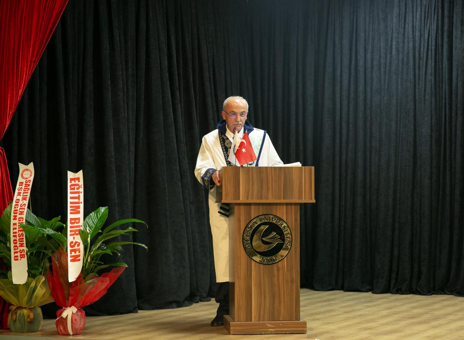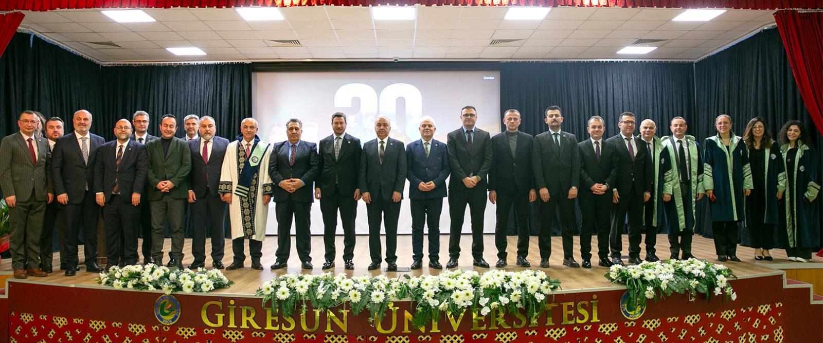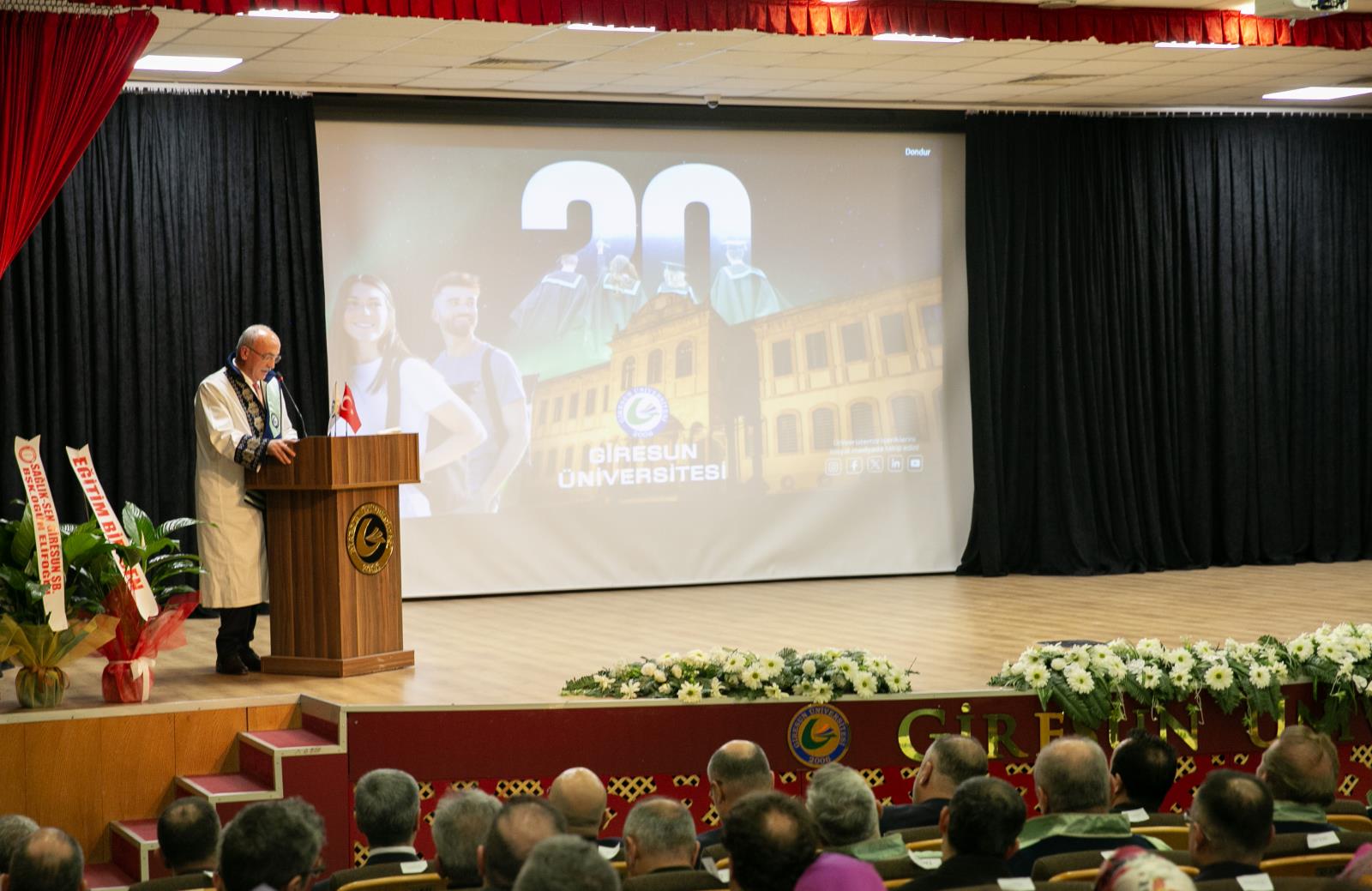 Üniversitemizin 20. kuruluş yıldönümü sebebiyle törende ilk konuşmayı Rektörümüz Prof. Dr. Yılmaz Can yaptı. Üniversitemizin son yirmi yıldaki gelişimi ve önemli faaliyetleri hakkında bilgi veren Rektörümüz yeni ve gelecek dönemler için planlanan bir dizi akademik çalışma hakkında da bazı açıklamalarda bulundu. Rektörümüz, Üniversitemizin YÖK tarafından "fındık" temalı üniversite ilan edilmesinin ardından bugüne kadar yürütülen çalışmalar ile devam eden ve planlanan diğer çalışmalarla ilgili olarak da önemli hususlara değindi. TEKNOFEST başta olmak üzere önemli bilimsel ve akademik platformlarda Üniversitemizin elde ettiği başarılara da değinen Rektörümüz, kuruluşundan bugüne Üniversitemize katkılarda bulunmuş herkese ayrı ayrı teşekkür etti.