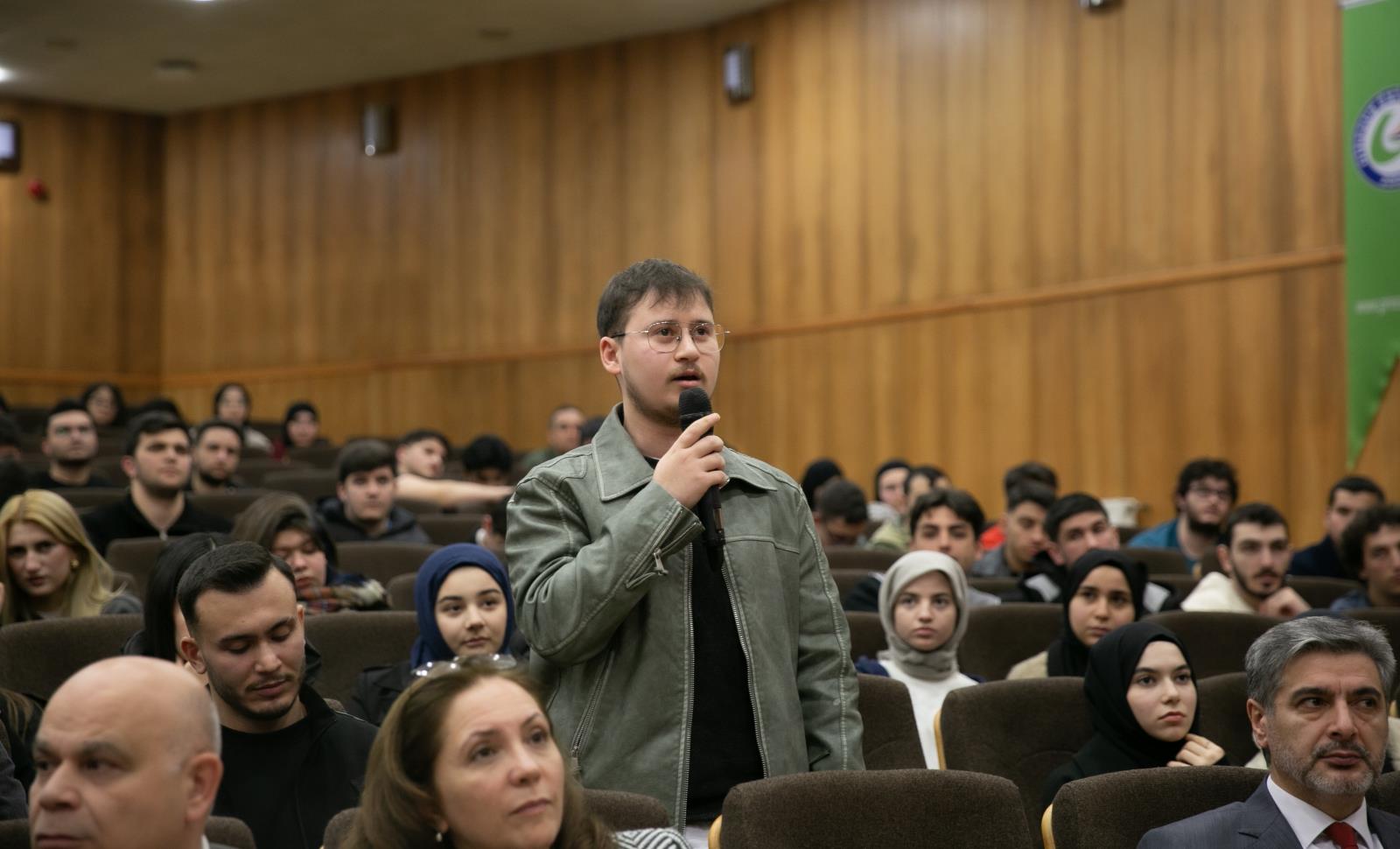 Konferansa konuşmacı olarak katılan Türkiye Düşüne Platformu Başkanı Taşkın Koçak, yapay zekânın tarihsel gelişim sürecinden başlayarak günümüzde ulaştığı noktayı kapsamlı bir sunumla ele aldı. Koçak, yapay zekânın iş gücü ve meslekler üzerindeki mevcut ve gelecekteki etkilerine değinerek, dönüşen meslekler, yeni ortaya çıkan kariyer alanları ve yetkinlik gereksinimleri hakkında önemli değerlendirmelerde bulundu. Yapay zekânın sunduğu fırsatların yanı sıra etik, güvenlik ve istihdam boyutundaki risklerine de dikkat çeken Koçak, özellikle bu alanda kariyer planlayan öğrencilere yönelik yol gösterici öneriler paylaştı. Öğrencilerin teknik bilgi kadar analitik düşünme, problem çözme ve sürekli öğrenme becerilerini geliştirmelerinin önemine vurgu yaptı.