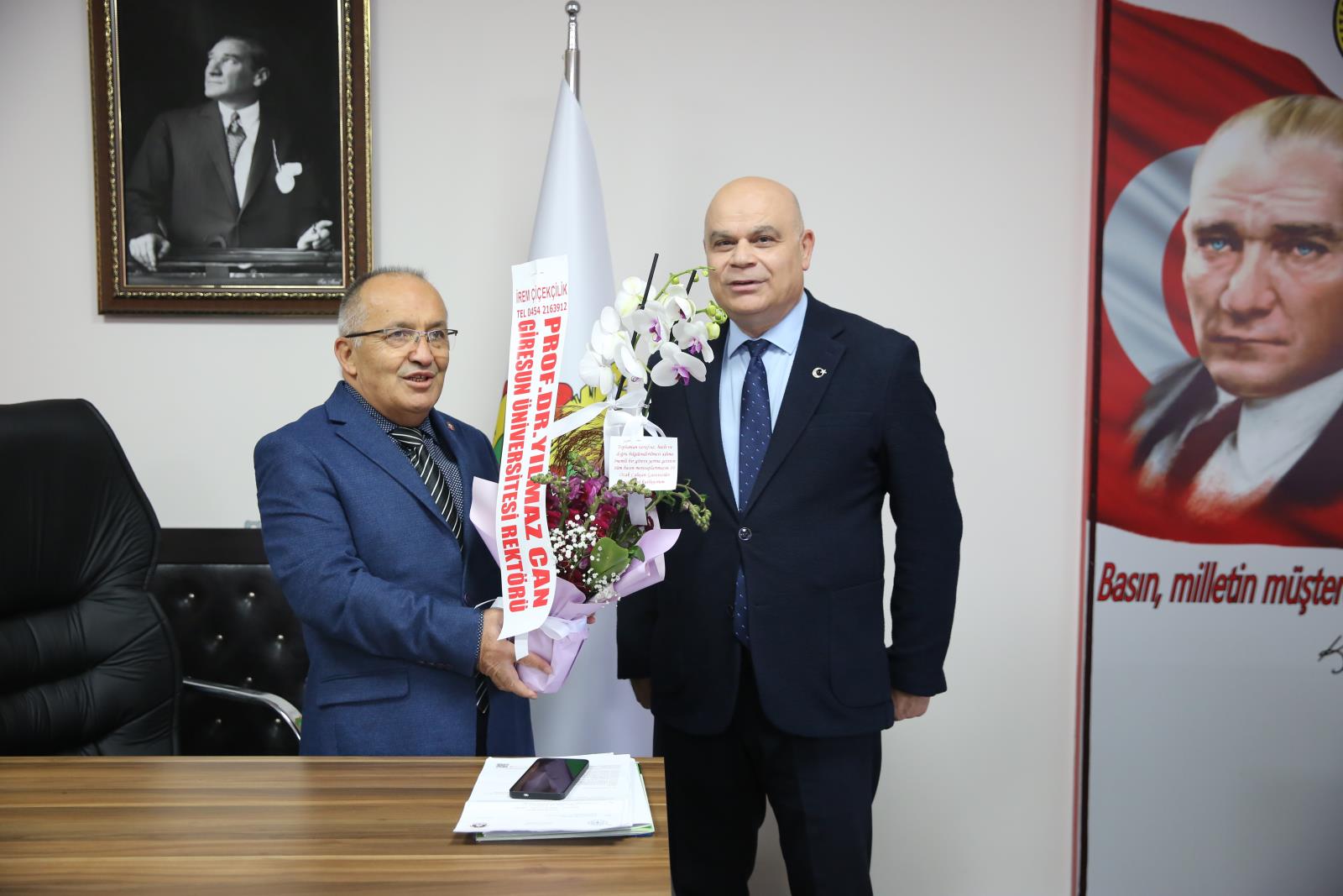 Prof. Dr. Güven Özdem Giresun Gazeteciler Cemiyeti Başkanı Bekir Bayram'a bir çiçek takdim ederek, kendisinin nezdinde tüm gazete çalışanlarının bu önemli gününü kutladı. Yurtdışında bulunması sebebiyle ziyarete katılamayan Rektörümüz Prof. Dr. Yılmaz Can'ın selam ve tebriklerini iletti.