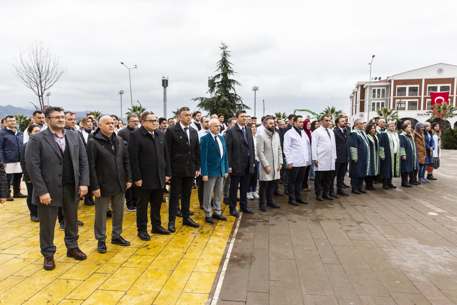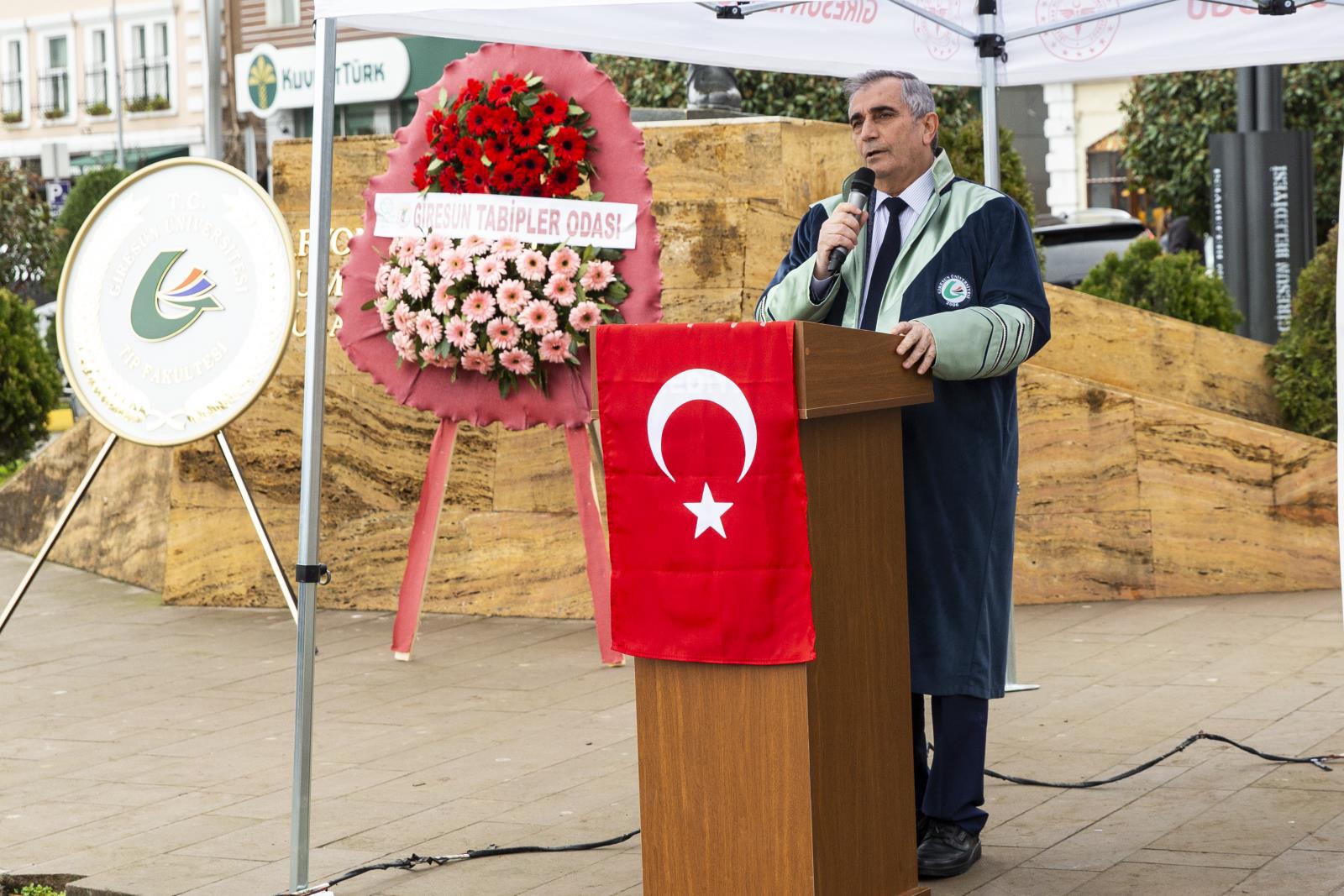 Düzenlenen törende bir konuşma yapan Tıp Fakültesi Dekanı Prof. Dr. Erdal Ağar, "Tıp Bayramı aslında düşman işgaline karşı yakılan meşalenin adıdır. Bu direnişin adının bizim mesleğimiz ile anılması gurur verici bir durumdur. Deprem afeti dolayısıyla, Tıp Bayramı etkinliklerini iptal ettik. İl Sağlık Müdürlüğü, Tabipler Odası ve Üniversite olarak ortak bir çelenk koyma töreni yapılmasına karar verdik. Depremde sadece binalar yıkılmadı. Bizim umutlarımız da yıkıldı. Binaların enkazında sadece canlar kalmadı. Bizim yüreğimizde o enkazların altında kaldı. Acımız çok büyük. Ama unutmayalım ki, milletimizin feraseti ve birlik olma duygusu o acımızdan daha da büyüktür. Ne zaman bu milletin yardıma ve desteğe ihtiyacı olmuşsa, başta hekimlerimiz olmak üzere, tüm sağlık çalışanlarımız anında milletimizin yanında olmuştur. Bu felaketin ilk anında da yine milletimize uzanan ilk el olduk... Hala da olmaya devam ediyoruz. Yaşadığımız matem, sözün bittiği yerdir. Başta hekimlerimiz ve sağlık çalışanlarımız olmak üzere depremde vefat edenlere tekrar Allah'tan rahmet diliyoruz. Hekimler olarak her zaman milletimize uzanan ilk el olmaya devam edeceğiz. Tüm sağlık çalışanlarımıza saygılar sunar, 14 Mart Tıp Bayramlarını kutlarım" dedi.
