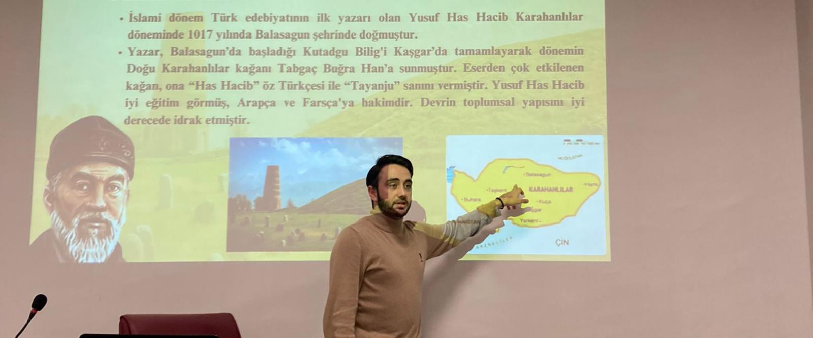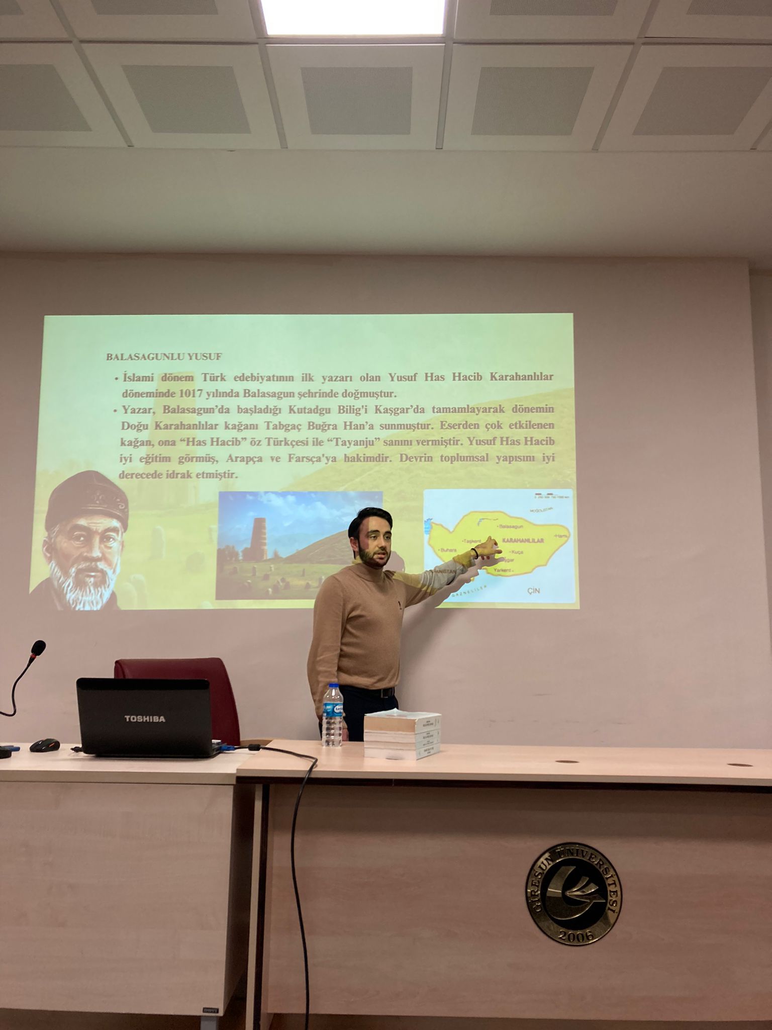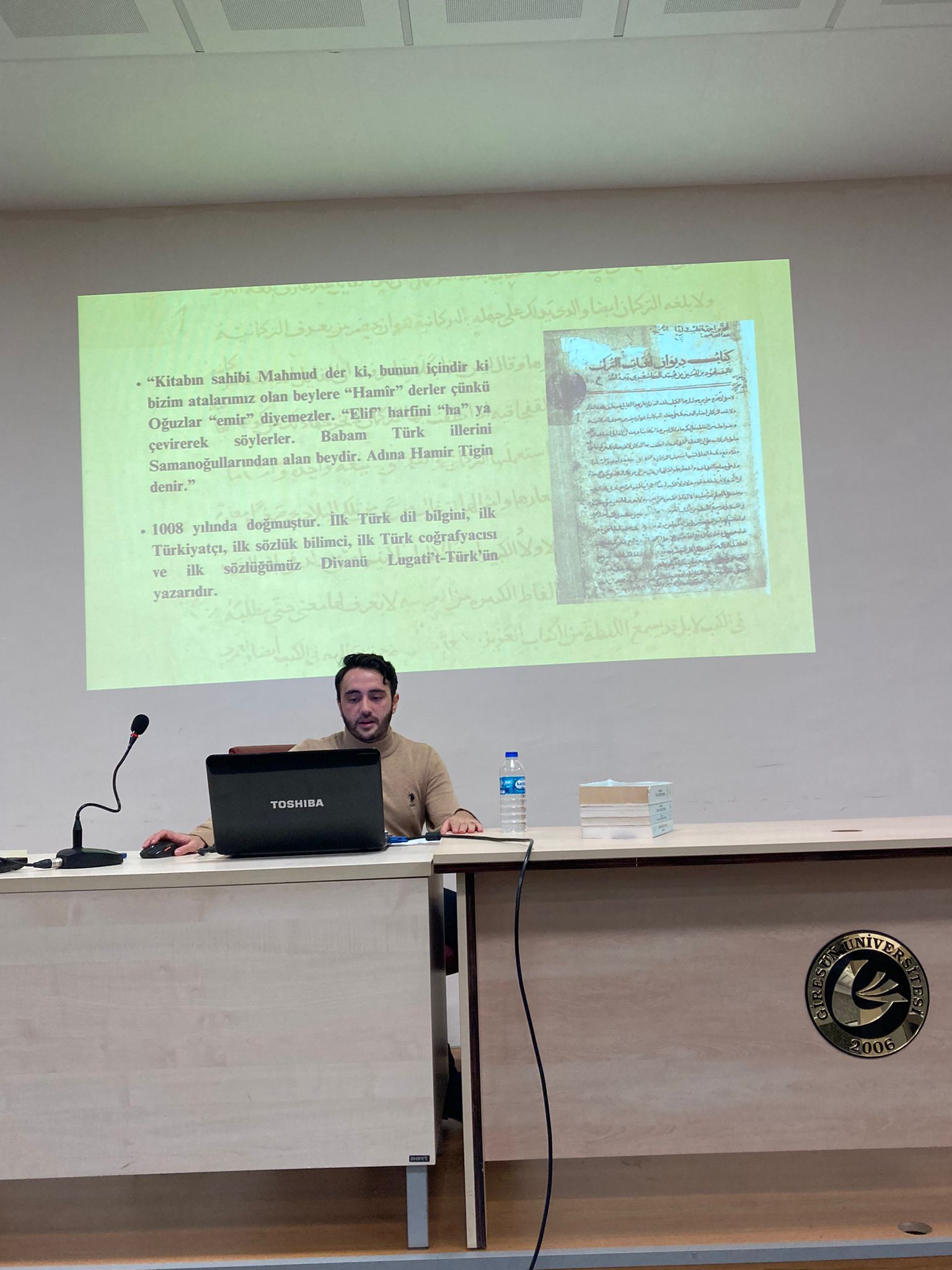 Üniversitemiz akademik ve idari personelinin yanı sıra öğrencilerin katıldığı konferansta topluluk başkanı Kadir KADAKAL, Kaşgarlı Mahmud ve Divanu Lügati't Türk'ün Türk kültür ve siyaseti açısından önemini katılımcılara aktarıldı.