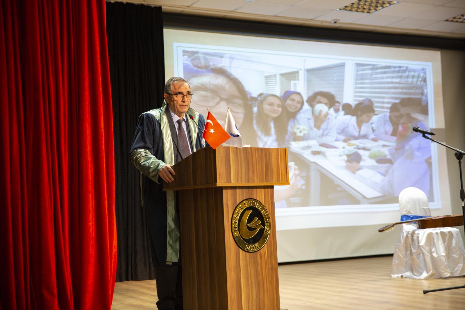 Törenin devamında konuşan Rektörümüz Prof. Dr. Yılmaz Can, “14 Mart tıp Bayramı’nı kutluyorum. Hekimlik tarihin her döneminde saygın bir meslek olmuştur. Bundan sonra da saygın bir meslek olarak devam edecektir. Acılarımızı dindiren, yaralarımızı saran hekimlerimizi, sağlık çalışanlarımızı saygıyla selamlıyorum. Yakın süreçte bir pandemi yaşadık ve bu dönemde onların ne büyük bir özveri göstererek hizmet ettiklerini çok yakından biliyorum. Hekimlerimize ve sağlık çalışanlarımıza yönelik şiddeti reddediyorum ve kınıyorum. Bu noktada bir an önce ciddi yasal düzenlemeler yapılacağını umuyorum. Erdal Hoca’mın şahsında Tıp Fakültemiz çatısı altında çalışan okuyan emek veren herkesi tekrar selamlıyorum, bayramlarını kutluyorum. Gençlerimize başarılar diliyorum.” dedi.