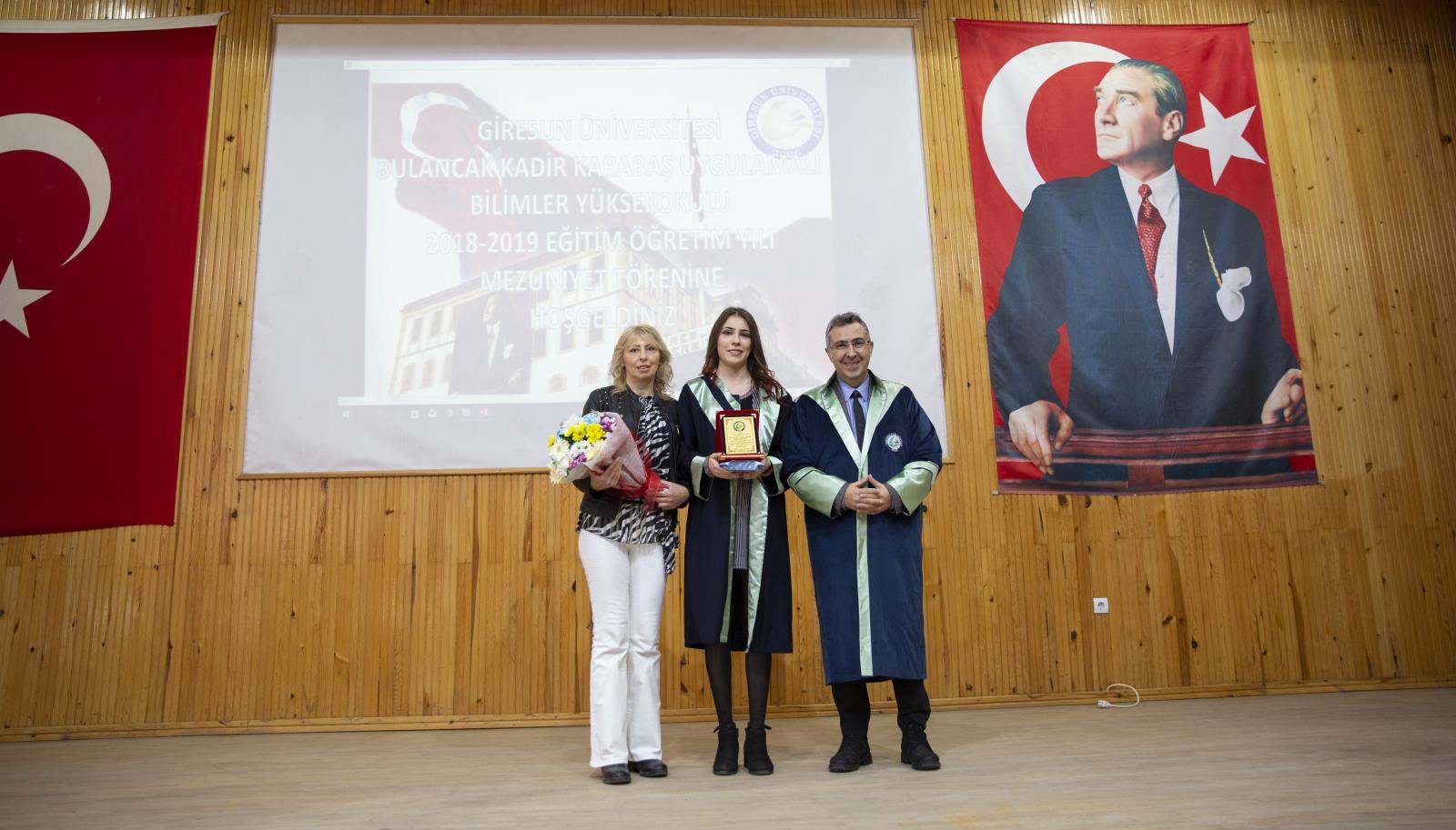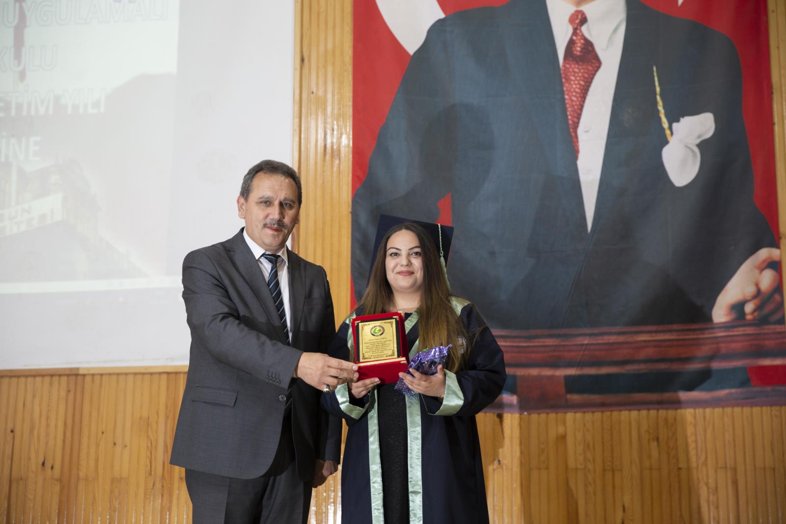 Okul birincisi Uluslararası Ticaret Bölümü öğrencisi Cansu Erbaş’ın okul kütüğüne plaket çakmasının ardından Yüksekokul ikincisi Sertan Güler ve üçüncü Betül Aydeniz de kürsüye davet edilerek ödülleri takdim edildi.