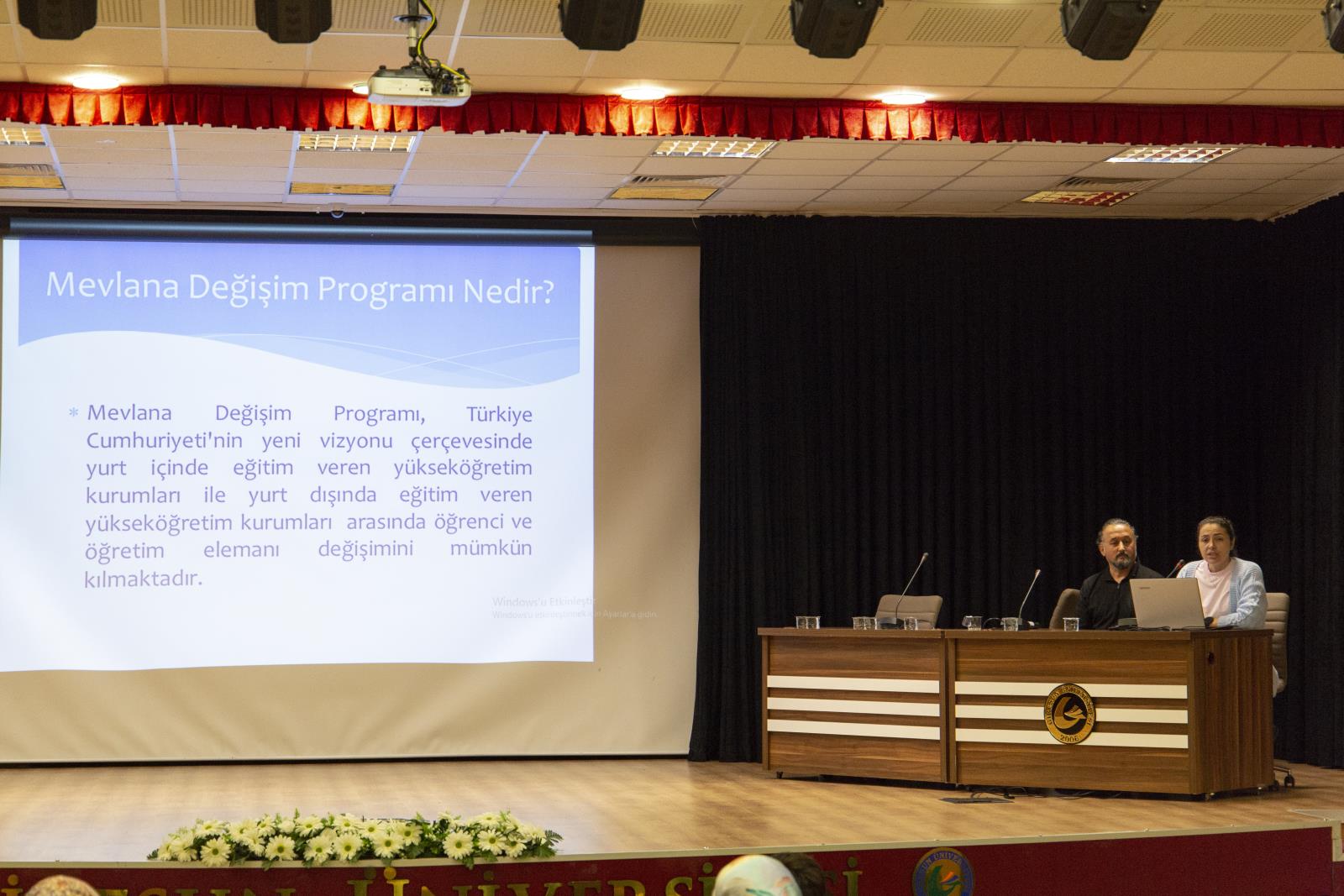 Erasmus ve Farabi Koordinatörlükleri adına konuşan Öğr. Gör. Adem Usta ile Mevlana Kurum Koordinatörlüğü adına söz alan Öğr. Gör. Dr. Anıl Manguş, Erasmus, Farabi ve Mevlana değişim programlarının genel çerçevelerini öğrencilere aktardılar.
