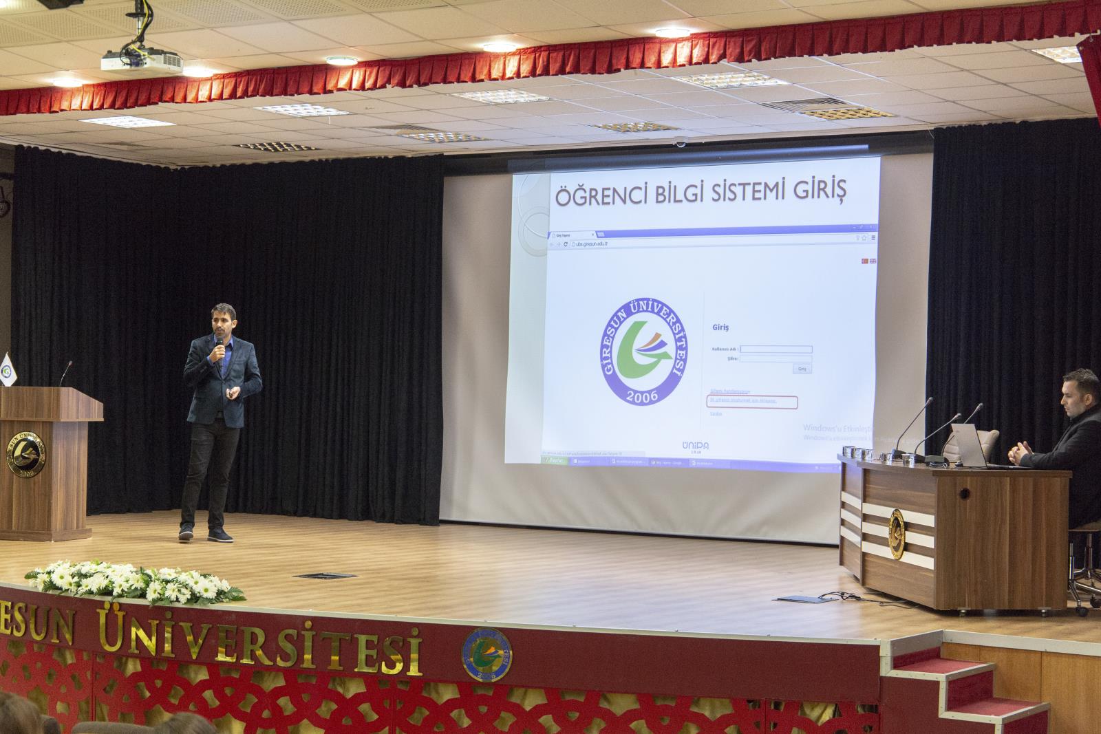 Öğrenci İşleri Daire Başkanlığının iş ve işleyişinden kısaca bahseden Arslan, daha sonra; öğrenci bilgi sistemi, öğretim süresi, akademik takvim, öğrenci danışmanlığı, kayıt yenileme işlemleri, dersler ve sınavlar, kayıt dondurma, katkı payı/öğrenim ücreti, muafiyet, kredi transferi, askerlik tecili, mezuniyet, çeşitli belgeler, burs imkanları ve mobil uygulamalar hakkında bilgiler verdi.