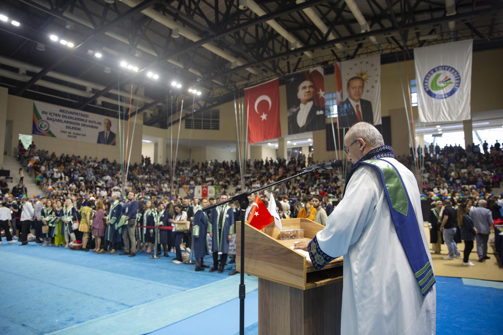 Üniversitemizin yerleşkeleri hakkında da kısa açıklamalar yapan Rektörümüz, törene iştirak eden öğrenci velilerini de tebrik ederek, "emanetlerinizi en iyi şekilde eğitip yetiştirerek size teslim etmenin gururunu ve sevincini yaşıyoruz. Bundan sonra hizmet sırası gençlerimizde. Aldıkları eğitimin sorumluluklarını yerine getireceklerine inancım tamdır" diye konuştu.
