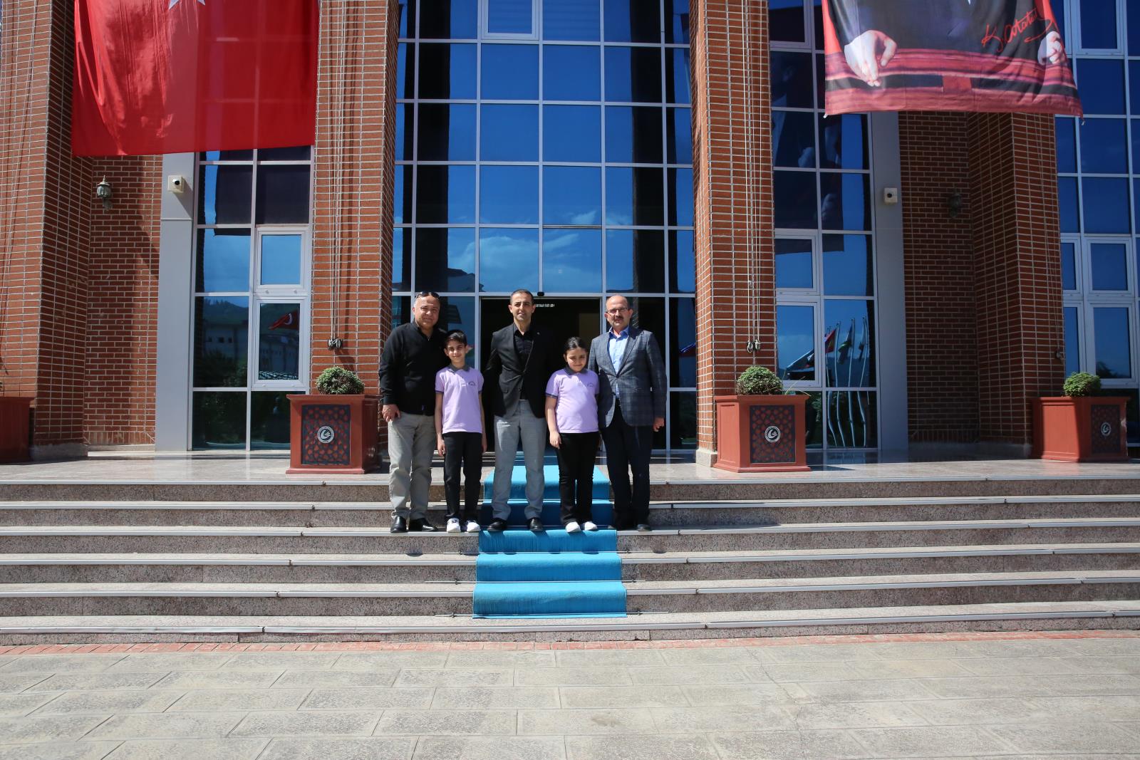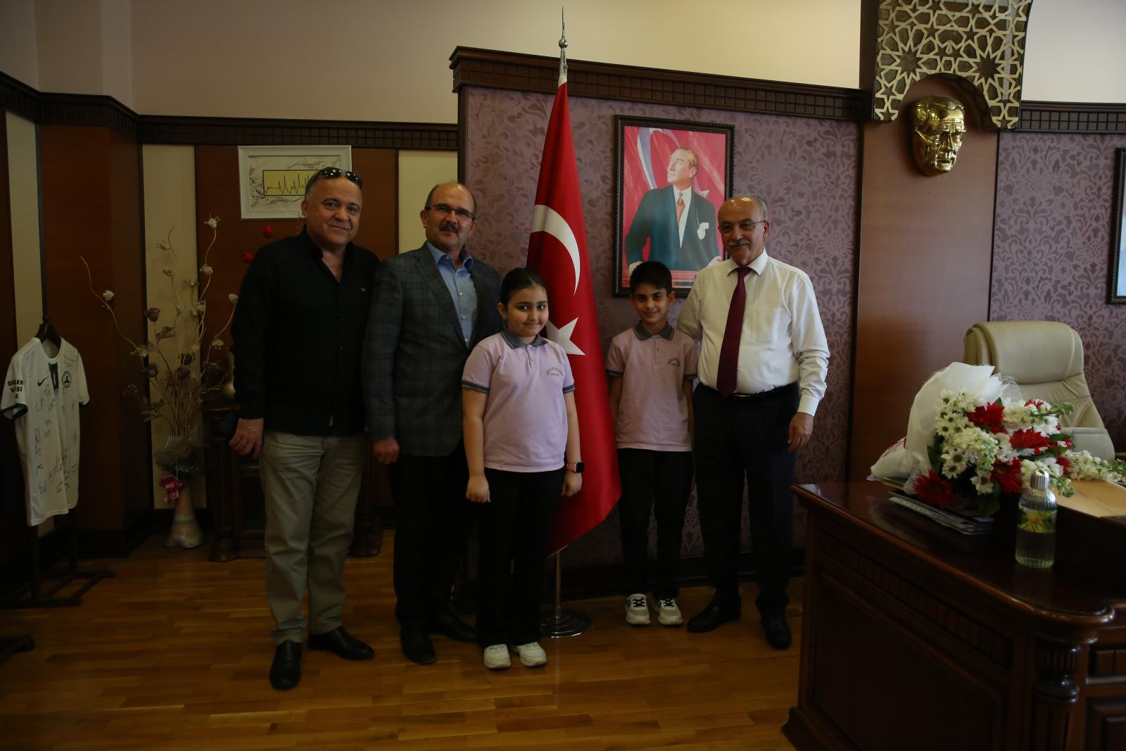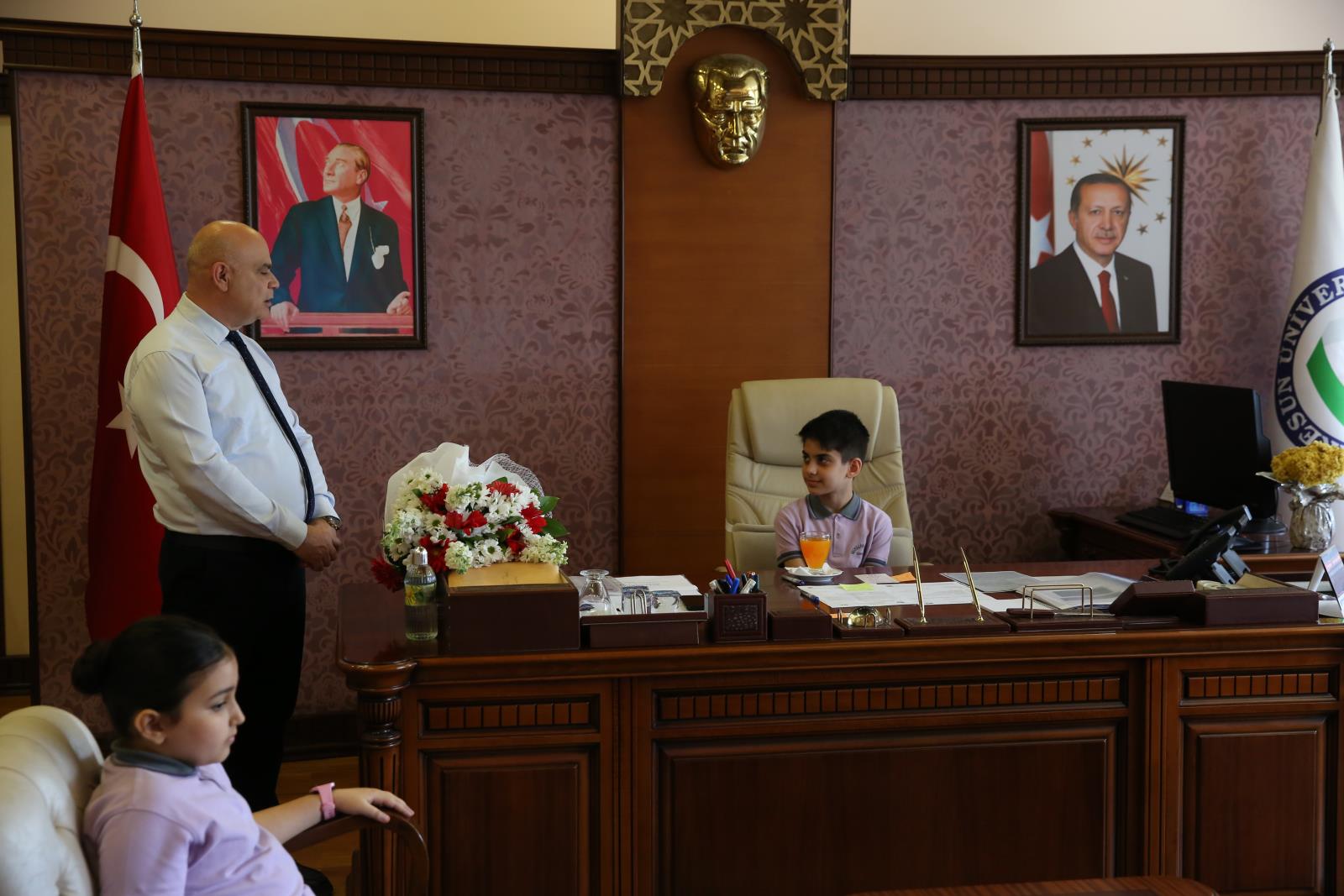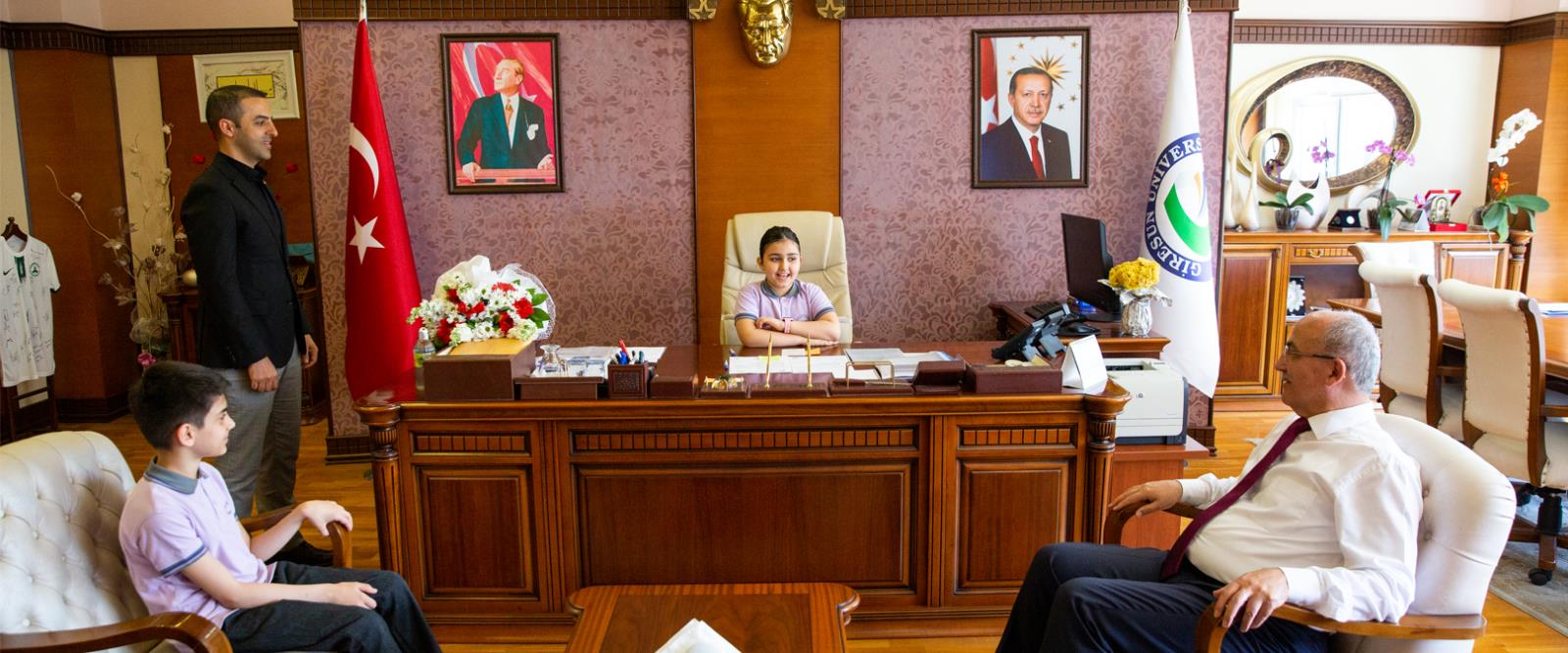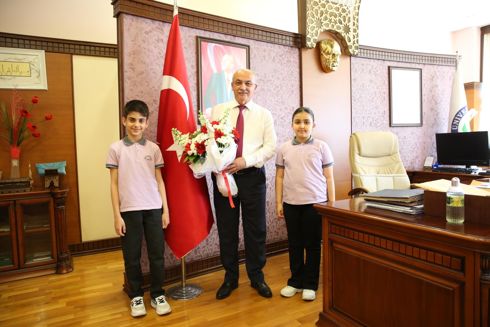 4. sınıf öğrencileri Edanaz Çanakci ve Yusuf Efe Emre, sınıf öğretmeni Muhammet Meşe ve okul müdürü Zeki Soylu'nun yer aldığı ziyarette Rektörümüz öğrencilerle temsili makam değişimi yaparak bir süreliğine makamını öğrencilere devretti. Ziyaretten duyduğu memnuniyeti dile getiren Rektörümüz Prof. Dr. Yılmaz Can, öğrencilerin bayramını kutlayarak kendilerine sağlıklı, mutlu ve başarı dolu bir gelecek temennisinde bulundu.