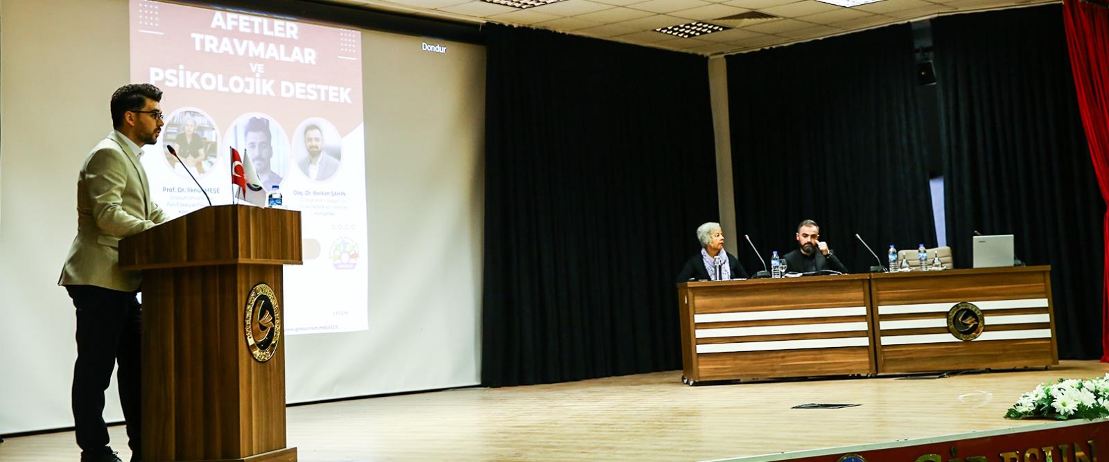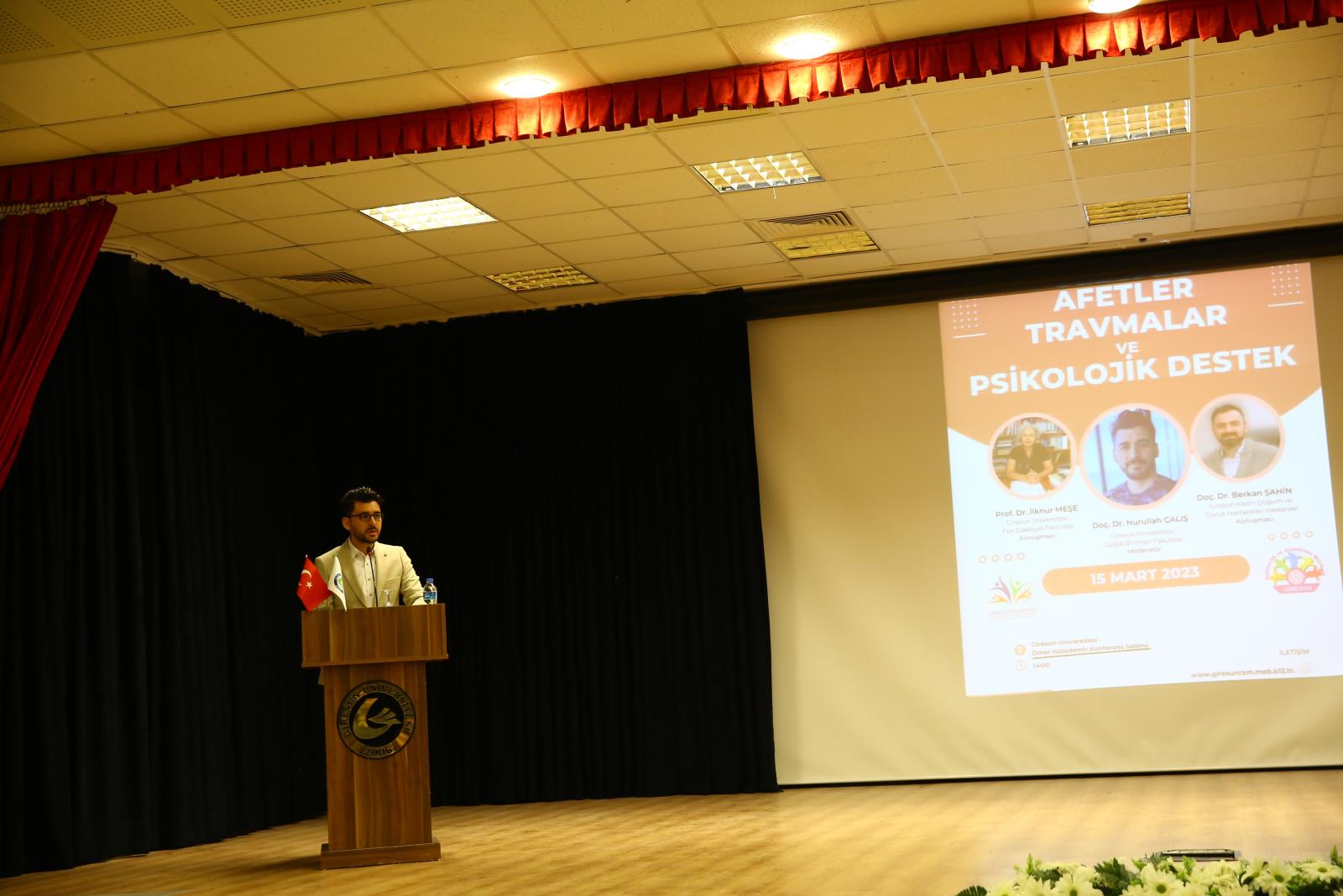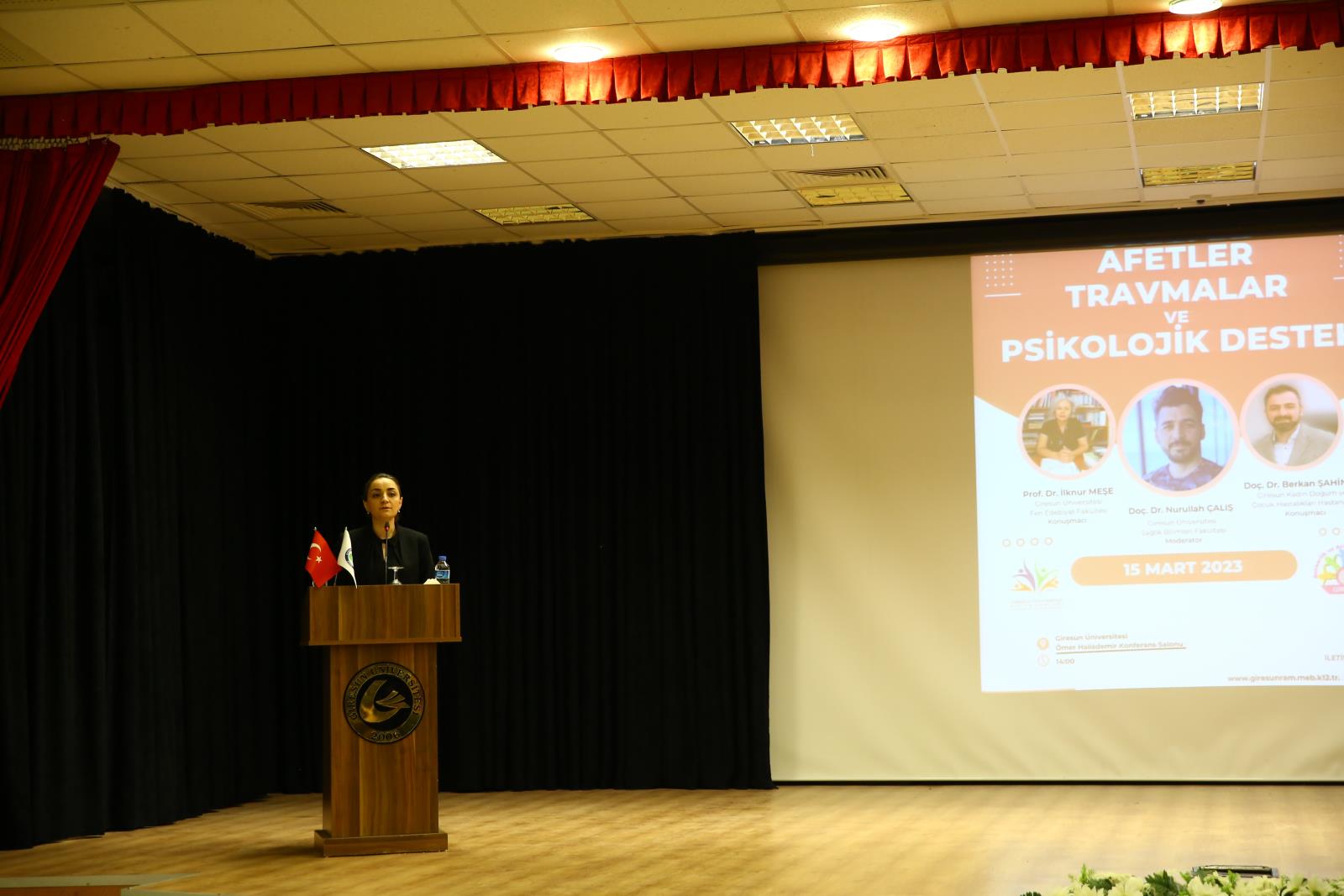6 Şubat 2023’te gerçekleşen ve 10 ilimizi önemli ölçüde etkileyen depremin fiziki zararları ve can kayıplarının yanında tüm ülkemizi ve dünyayı sosyal, duygusal ve psikolojik olarak da etkiledi. Afet sonrası yürütülen hizmetlerin bir parçası olarak psikososyal hizmetler günümüzde yaşanan afetler sonrasında gerçekleştirilen önemli destek süreçleridir. Bu kapsamda Giresun Üniversitesi Çocuk Hakları Uygulama ve Araştırma Merkezi ve Giresun Rehberlik Araştırma Merkezi iş birliğiyle, Üniversitemiz Fen Edebiyat Fakültesi Sosyoloji Öğretim Üyesi Prof. Dr. İlknur Meşe, Sağlık Bilimleri Fakültesi Sosyal Hizmetler Ana Bilim Dalı Öğretim Üyesi Doç. Dr. Nurullah Çalış, Giresun Üniversitesi Tıp Fakültesi Çocuk ve Ergen Ruh Sağlığı ve Hastalıkları Ana Bilim Dalı Öğretim Üyesi Doç. Dr. Berkan Şahin tarafından Giresun Rehberlik ve Araştırma Merkezi hizmet bölgesinde(Merkez, Piraziz, Bulancak, Keşap, Yağlıdere, Espiye, Dereli) görev yapan Rehber Öğretmen/Psikolojik Danışmalar ve eğitimcilere yönelik “Afetler, Travmalar ve Psikolojik Destek” konulu seminer gerçekleştirildi.