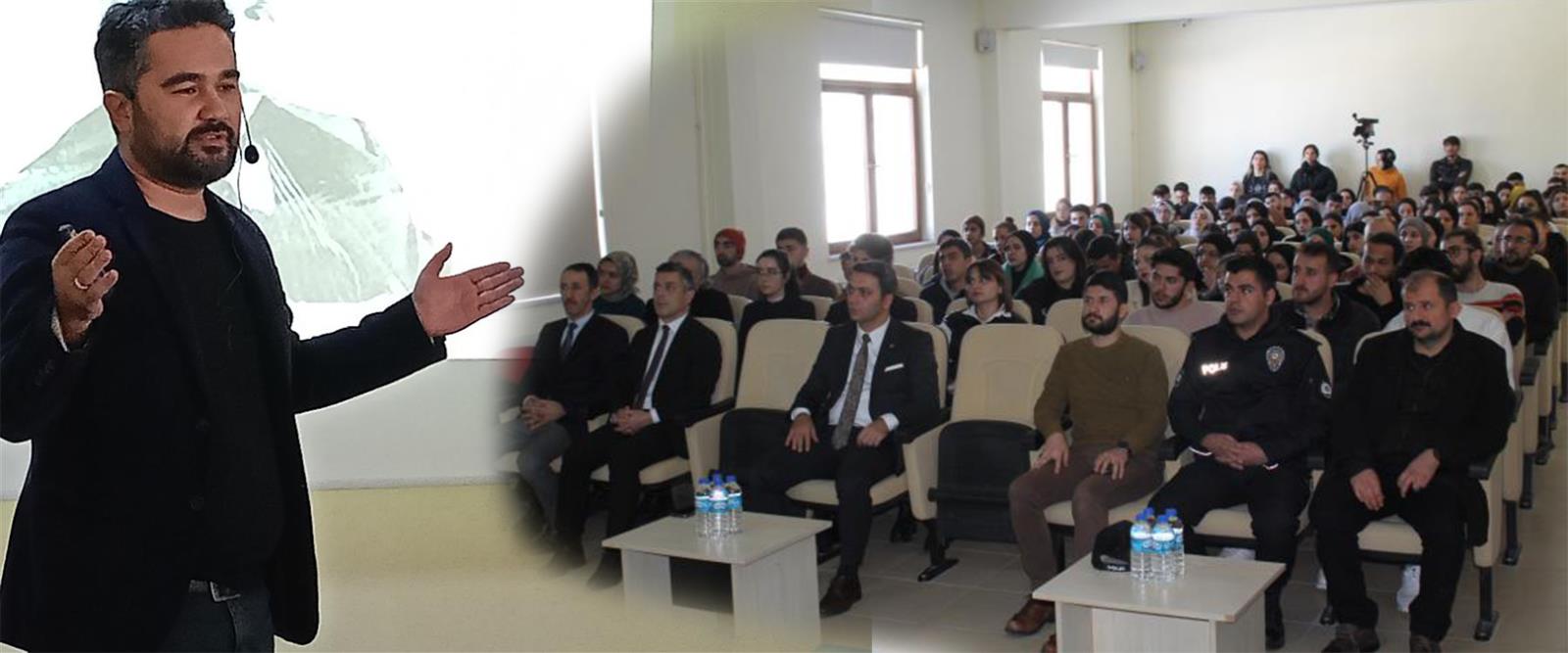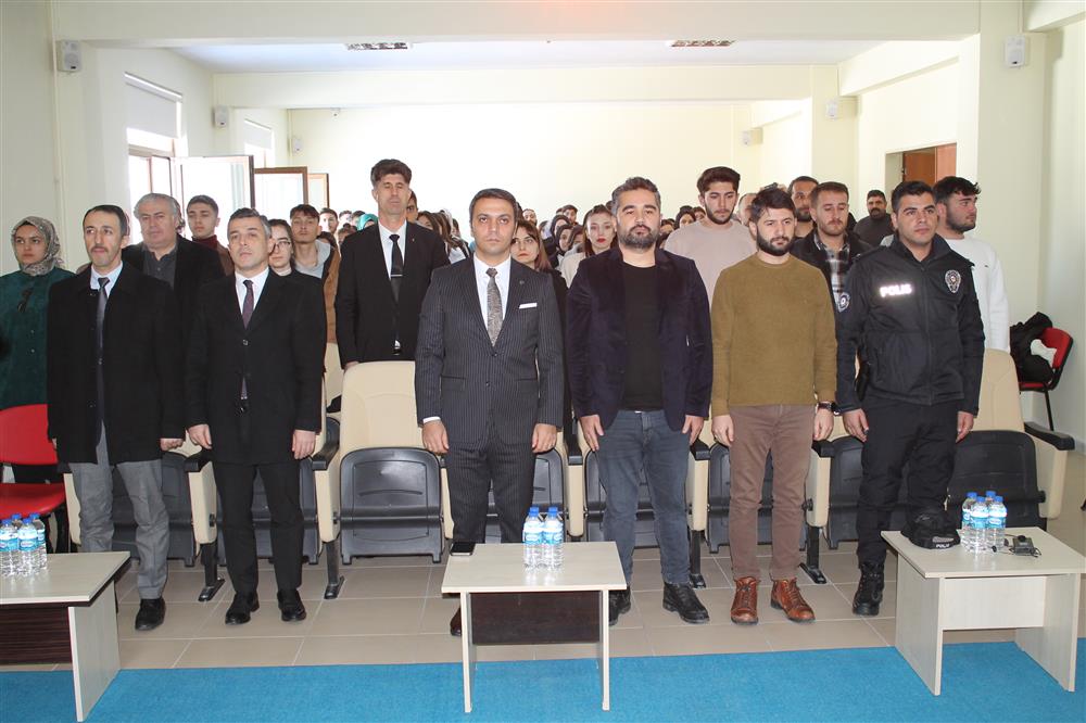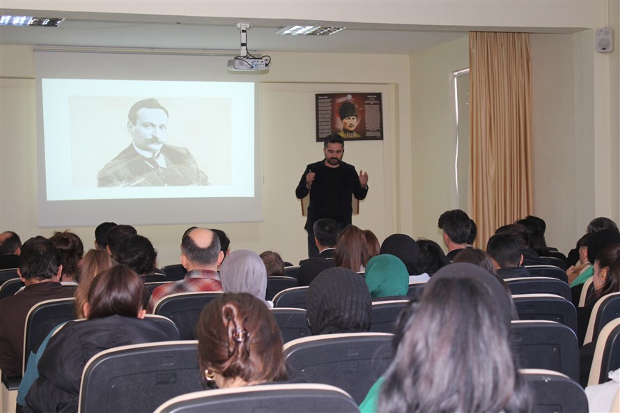 Yüksekokul Müdürü Sarı, Mehmet Akif Ersoy’un hayatındaki önemli kişilerden yola çıkarak İstiklal Marşı şairinin hayatından kesitler sundu. Sarı “Sözünün eri ne demek diye tanımlama yapmamı isterseniz sadece Mehmet Akif Ersoy derim. Çünkü dediğini yapmak, dostlarını canı pahasına korumak ve savunmak onun hayatının en büyük değerlerindendi. Paraya asla tamah etmeyen aç kalsa da sözünden dönmeyen Akif, fikirleriyle ve mücadelesiyle bize örnek oldu” diye konuştu. Müdür Sarı “Mehmet Akif Ersoy o yıllarda, o zor zamanlarda inandığını savunmaktan asla vazgeçmemiştir” dedi.