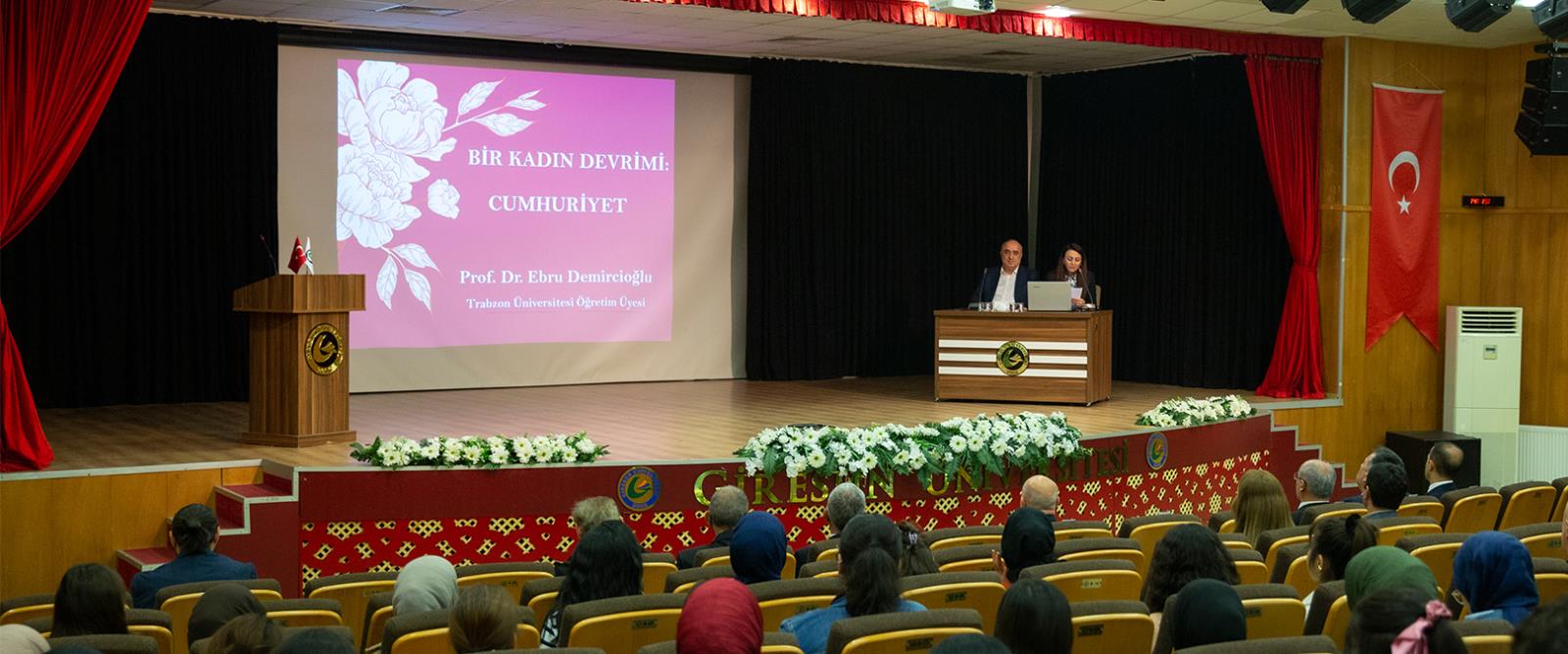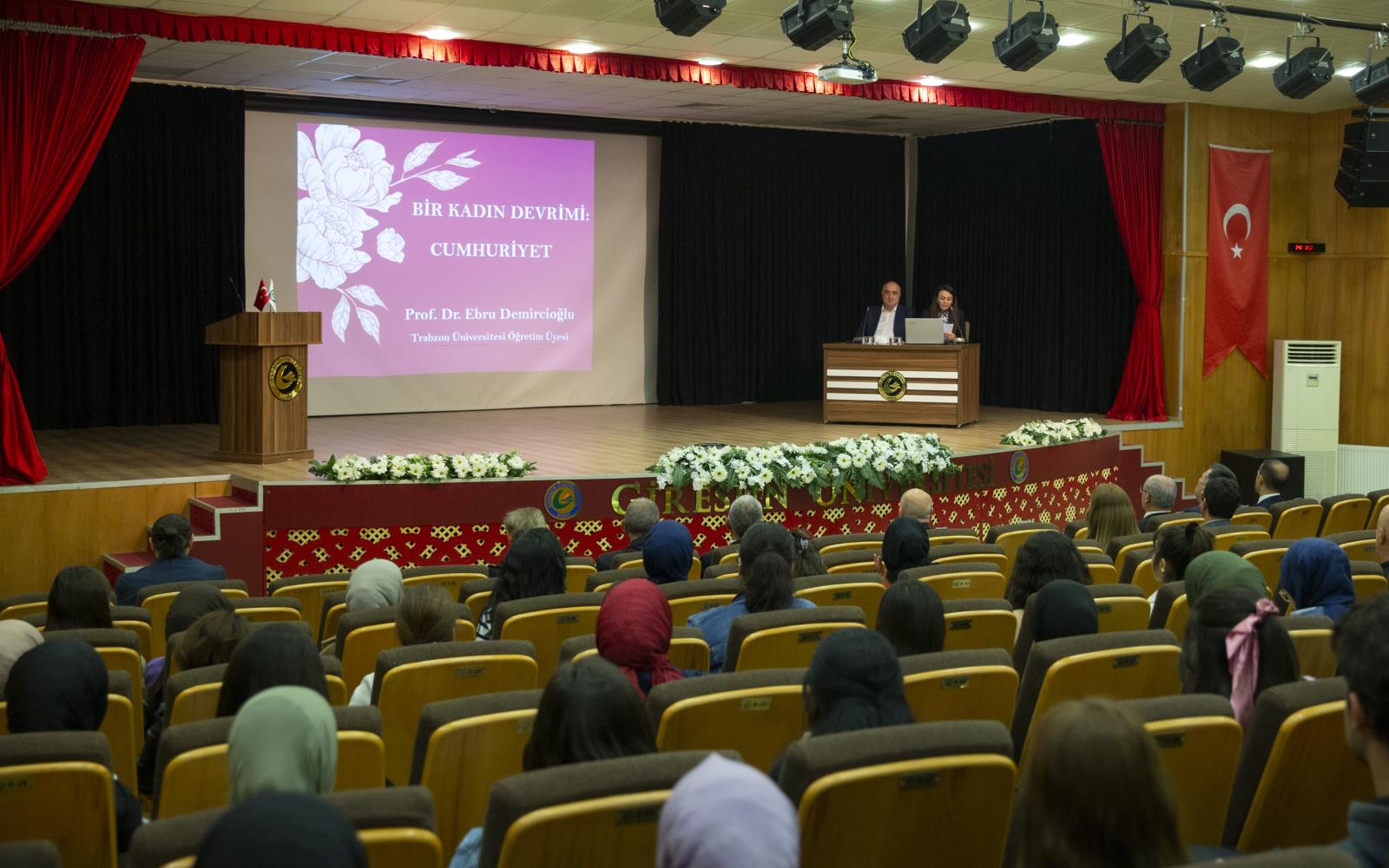 Cumhuriyet Döneminde Kadınlar başlığıyla sunumunu gerçekleştiren Prof. Dr. Ebru Demircioğlu, Cumhuriyetin ilanından bu yana yüz yılı aşkın sürede Ülkemizde kadınların elde ettikleri haklardan bahsetti. Prof. Dr. Demircioğlu, kadınların Cumhuriyetin ilanıyla birlikte pek çok alanda önemli hak kazanımlarının olduğunu vurgulayarak Cumhuriyet döneminde önemli izler bırakan kadınların mücadelelerini anlatarak sunumunu noktaladı.