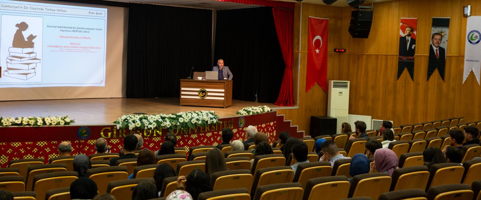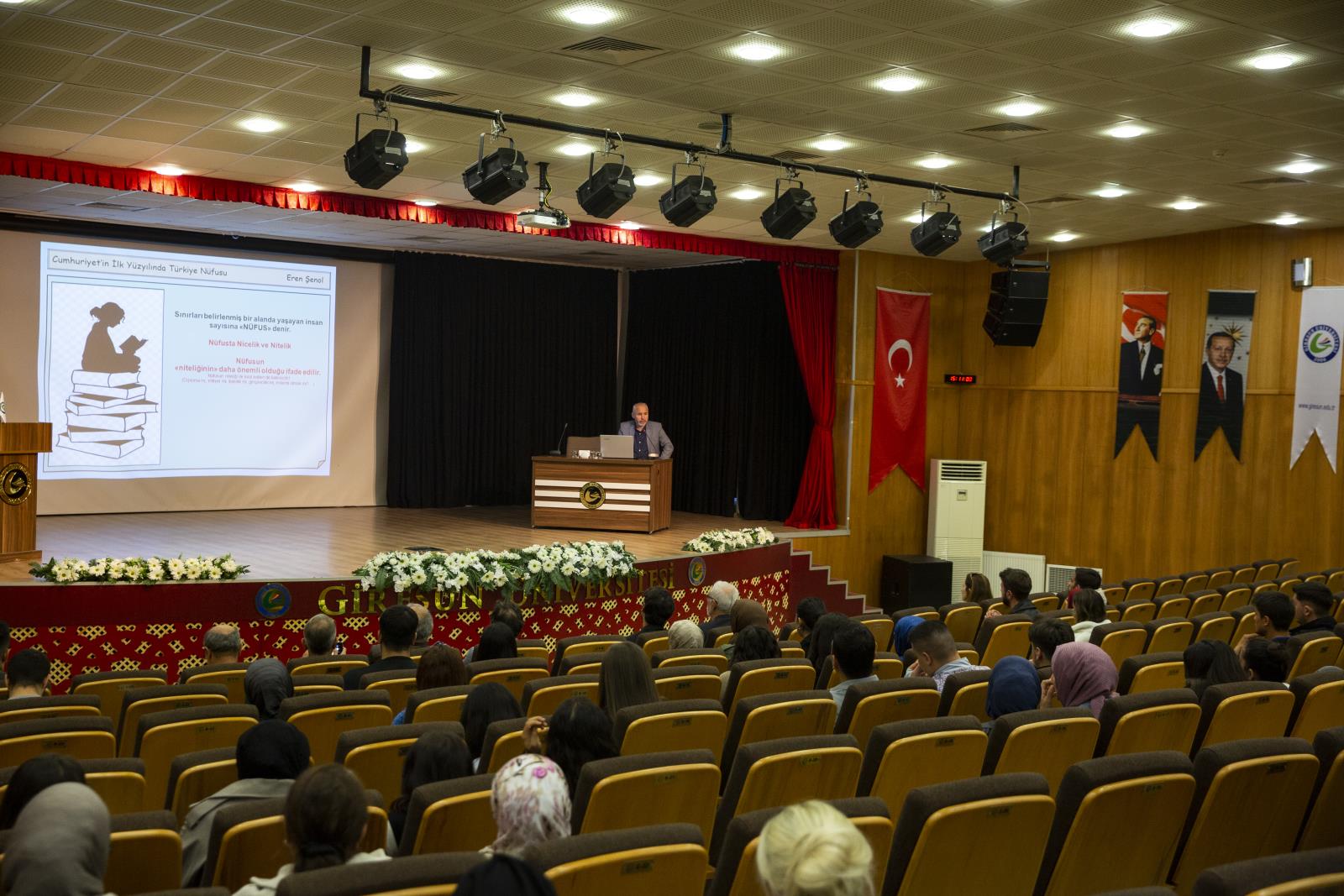 Giresun Üniversitesi Coğrafya Topluluğu tarafından 31 Ekim Perşembe günü, Güre Yerleşkesi Şehit Ömer Halisdemir Konferans Salonu’nda, Üniversitemiz Fen Edebiyat Fakültesi Coğrafya Bölümü öğretim üyesi Doç. Dr. Eren Şenol’un konuşmacı olduğu "Cumhuriyet'in İlk Yüzyılında Türkiye Nüfusu" konulu konferans düzenlendi.