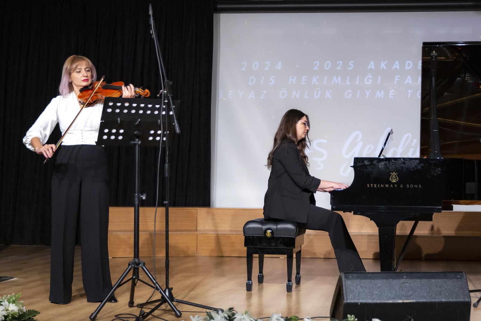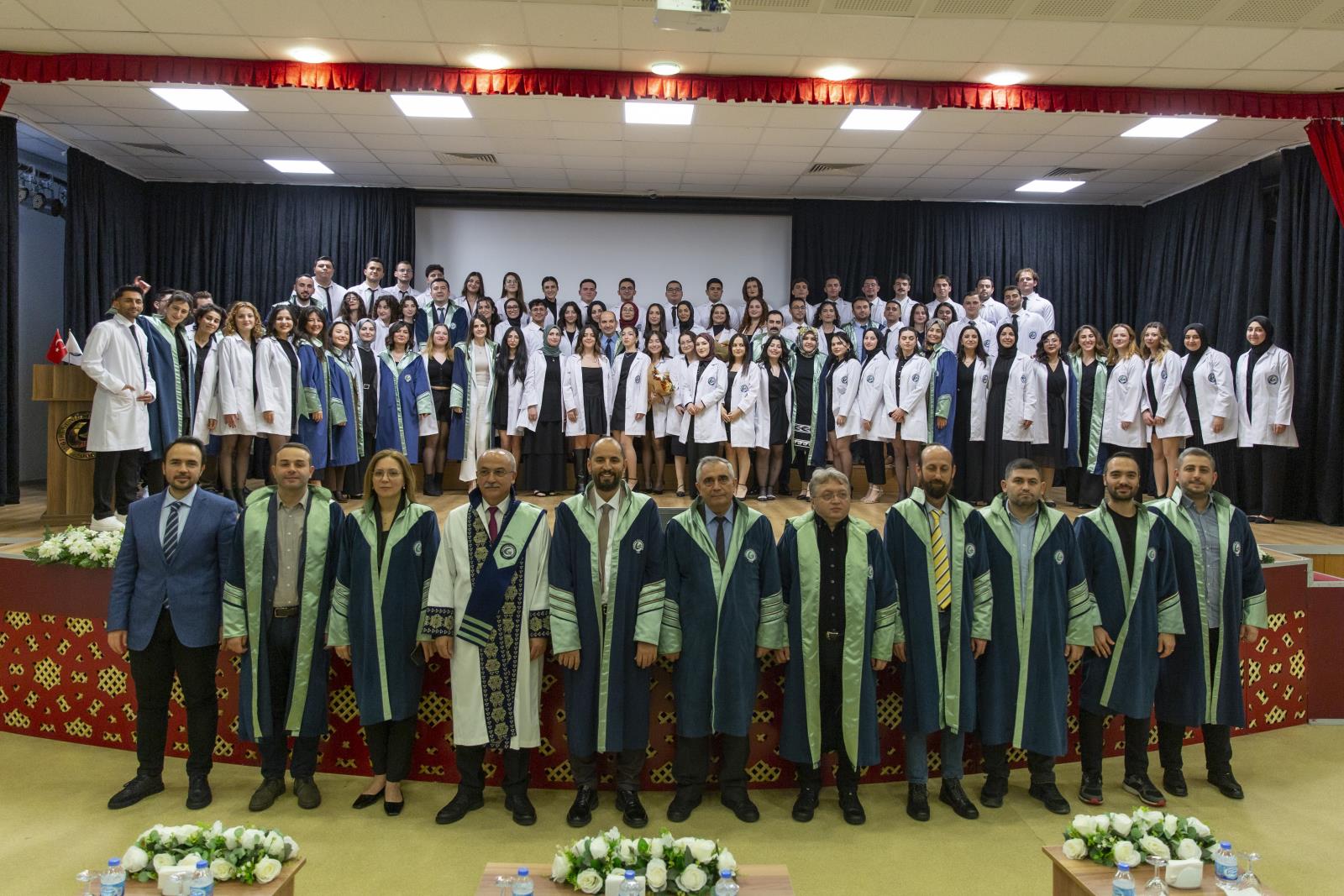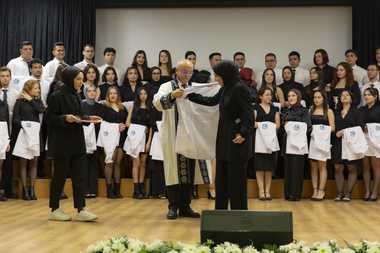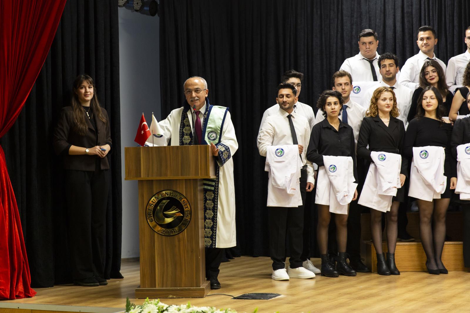 Törenin açılış konuşmasını yapan Diş Hekimliği Fakültesi Dekanı Prof. Dr. Çağrı Ural, “Bugün burada öğrencilerimizin mesleki anlamda çok önemli bir gününü, beyaz önlük giymelerini kutlamak için toplanmış bulunuyoruz. Bu tören mesleğimizin saflığını, dürüstlüğünü ve toplum sağlığına hizmet etmeyi simgeleyen bir sembol olarak anlam kazanmaktadır. Fakültemiz 2015 yılında kurulmuş olup 2020 yılında ilk öğrencilerini kabul etmiştir. Bugün gururla belirtmek isterim ki Fakültemiz 2023 yılı itibariyle klinik altyapısını tamamlamış ve hasta kabulüne başlamıştır. Bu süre zarfında çok hızlı bir gelişim ve büyüme göstermiş, sağladığı çağdaş olanaklarla yalnızca eğitimde değil sağlık hizmetinde de toplumumuza katkıda bulunmaya başlamıştır. Fakültemiz yaklaşık 5 bin metrekarelik bir alana yayılmış olup modern altyapısıyla diş hekimliği eğitimini ve diş sağlığını hizmetini en iyi şekilde vermeyi amaçlamaktadır. Şu an da 29 diş hekimi koltuğu ile öğrencilerimizin klinik deneyimlerini geliştirmeleri ve hastalarımıza kaliteli hizmet sunmaları için donanımlı bir altyapı olanağına sahibiz. Bu yıl toplamda 67 öğrencimiz beyaz önlüklerini giyecek. Fakültemizdeki 277 öğrencimiz eğitim görüyor. Öğrencilerimiz bu yıl itibariyle dördüncü sınıfta klinik uygulamalarına başladılar. Tüm öğrencilerimizin mesleki bilgi ve becerilerini en üst düzeyde geliştirmeleri için her türlü olanak ve desteği sağlama gayretindeyiz. Fakültemizde günümüz diş hekimliği vizyonuna uygun olarak diş hekimliği alanında öğrencilerimize güncel bir eğitim sunuyoruz.” ifadelerine yer verdi.