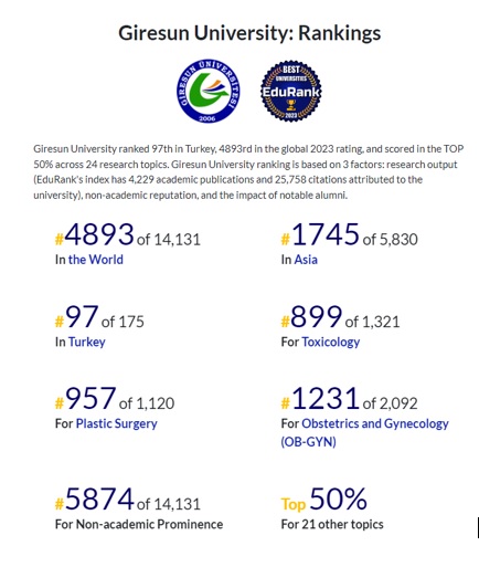 Edurank Endeksi tarafından hazırlanan 2023 yılına ait Üniversiteler sıralamasında, Giresun Üniversitesi Türkiye'deki 175 Üniversite arasında 97’inci sırada, dünya genelindeki 14 bin 131 Üniversite arasında ise 4 bin 893’üncü sırada yer aldı.