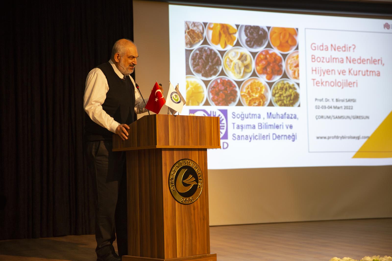 Prof. Dr. Y. Birol Saygı hijyen ve kurutma teknolojileri, “Güvenilir gıdaya ihtiyaç duyuyoruz. Sağlıklı olmak için beslenmeye ihtiyaç duyarız bu nedenle beslendiğimiz veya aldığımız gıdalara dikkat etmeliyiz. Dünyada beslenmede adaletsizlik söz konusu. Aynı zamanda savaşların önemli bir kısmı su ve gıda nedenlerinden yaşanmaktadır. Bu hususta dünyada bu denli önemli bir yere sahip olan gıdanın kalitesi de önem arz etmektedir. Beklentileri karşılaması gerekir. Gıda işlemesi veya bozulmasını durduramayız ancak yavaşlatabiliriz.” Açıklamalarında bulundu. Sunum sonunda fındığın bozulma reaksiyonlarının iyi incelenmesi ve saklama koşullarının iyi düzenlenmesi gerektiğini vurguladı.