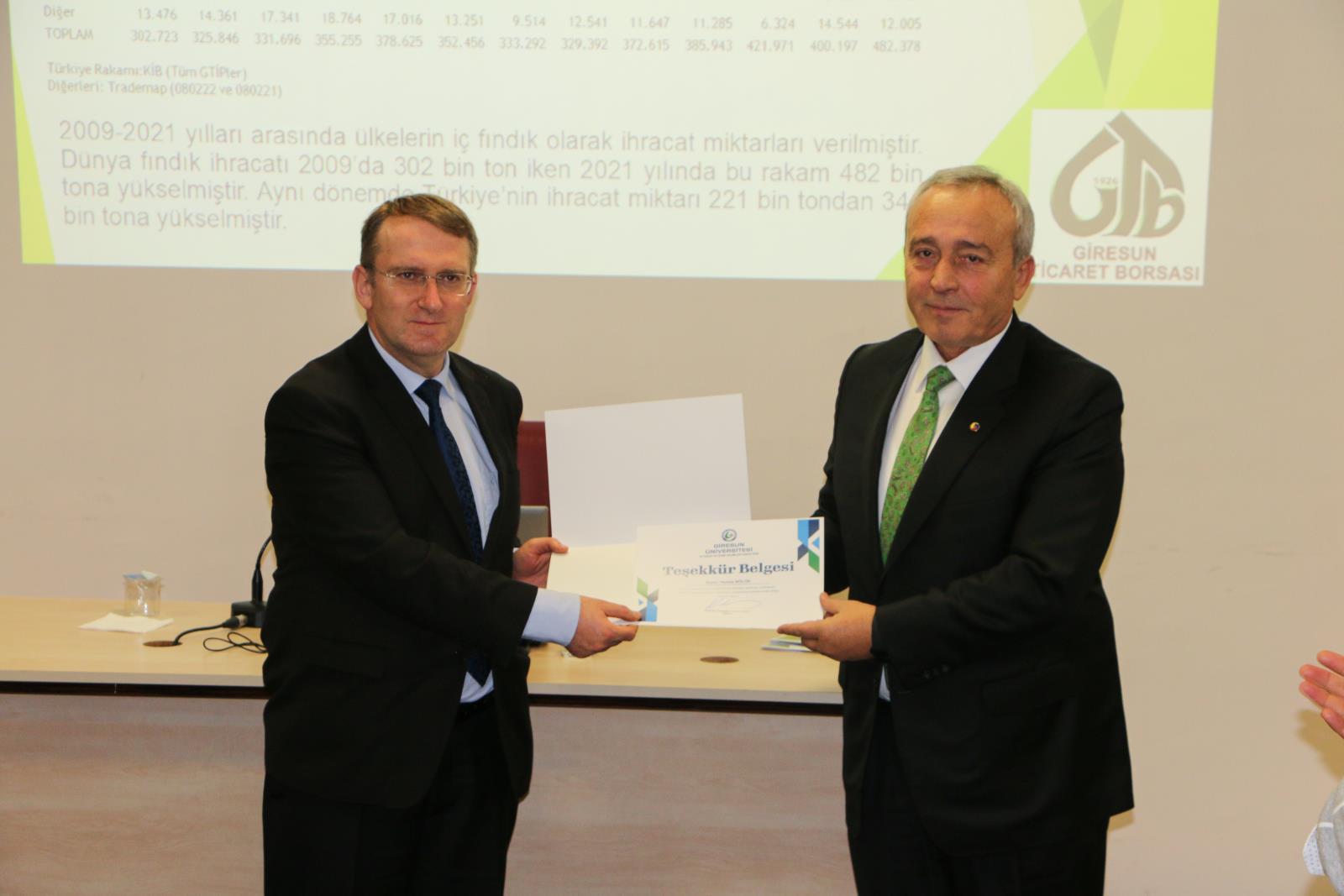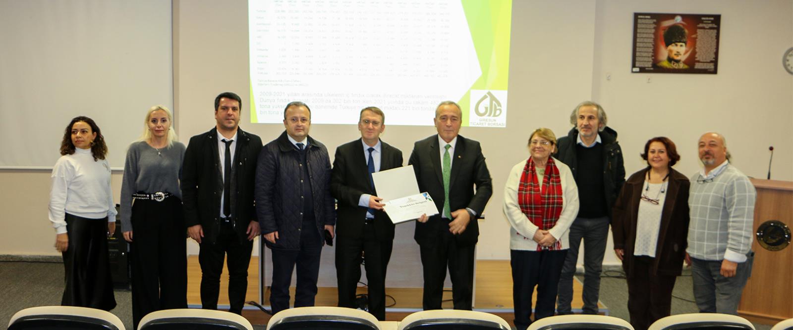 İktisadi ve İdari Bilimler Fakültesi Dekanı Prof. Dr. Kurtuluş Yılmaz Genç’in açılış konuşmasının ardından söz alan Hamza Bölük, konuşmasında öncelikle fındık tarımının tarihçesini anlattı. Hamza Bölük, fındıkta verimi yükseltmenin önemini vurguladı. Fındık ihracatında katma değer artışının gerekliliğini ifade eden Bölük, uluslararası markalar oluşturmanın Türkiye’nin fındıktan elde ettiği geliri artıracağını belirtti. Dünyada fındık dikim alanlarının farklı ülkelere yayılması yönünde arayışların olduğunu söyledi. Hamza Bölük, fındık ihracatının katma değeri yüksek ürünlerle gerçekleştirilmesinin ve yeni pazarlar bulunmasının Türkiye’deki fındık sektörünün temel ihtiyaçları olduğunu ifade etti.