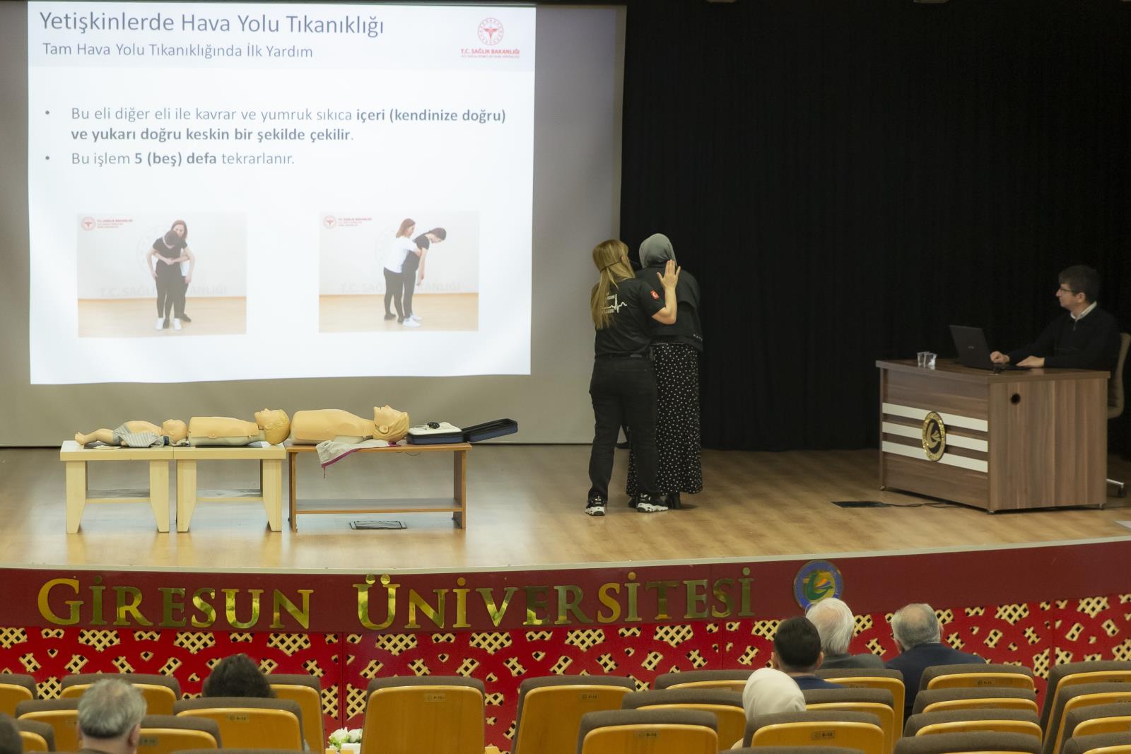Üniversitemizin Sivil Savunma Birimi tarafından organize edilen etkinlik, Giresun İl Sağlık Müdürlüğü Uzman İlk Yardım Eğitmeni Hemşire Gülay BİLGE’nin sunumuyla yapıldı. Programın açılışında konuşan GRÜ Sivil Savunma Uzmanı Ertuğrul YALÇIN, insan hayatının her an beklenmedik olaylarla karşı karşıya kalabileceğini belirterek, afet ve acil durumlarda, hastalık ve yaralanmalarda tıbbi yardım ulaşıncaya kadar geçen “altın dakikalar”da yapılan ilk yardımın hayati önem taşıdığını vurguladı. Yalçın, acil durumlarda her saniyenin değerli olduğuna dikkat çekti.