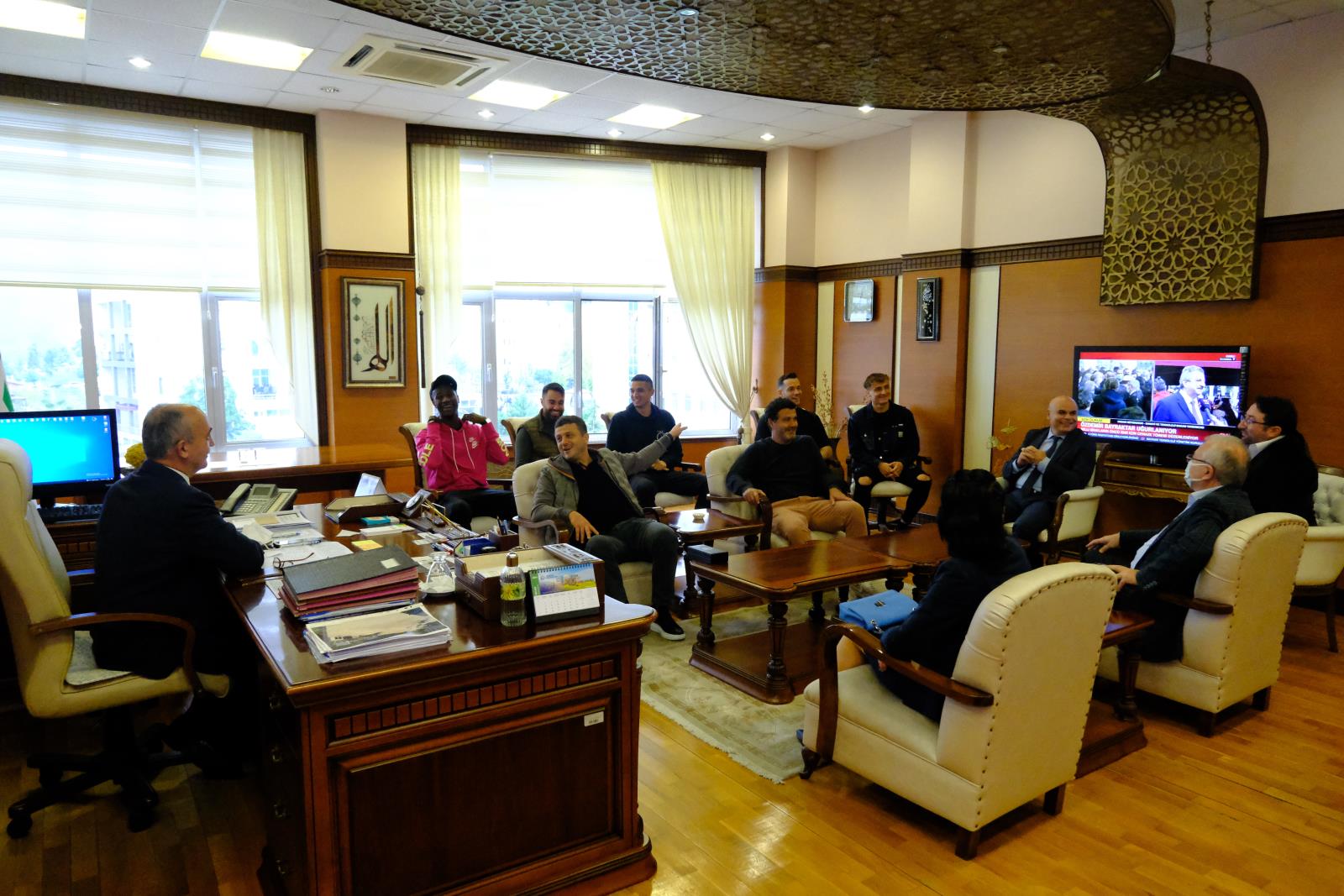 Üniversitemiz Rektörü Prof. Dr. Yılmaz Can ve beraberinde Rektör Yardımcıları Prof. Dr. Güven Özdem, Prof. Dr. Hüseyin Peker ile Spor Bilimleri Fakültesi Dekanı Prof. Dr. Birol Eltuğral'ın da iştirak ettiği sohbette söz alan Rektörümüz, Teknik Direktör Hakan Keleş nezdinde tüm kulübü başarılarından dolayı tebrik ederek, "Üniversite olarak her daim şehrimiz için bir marka olan Giresunspor'un yanındayız" dedi.