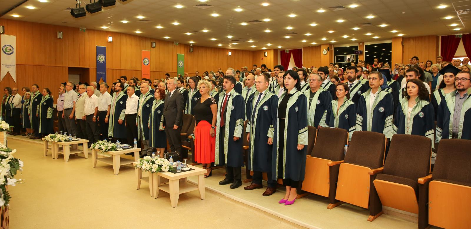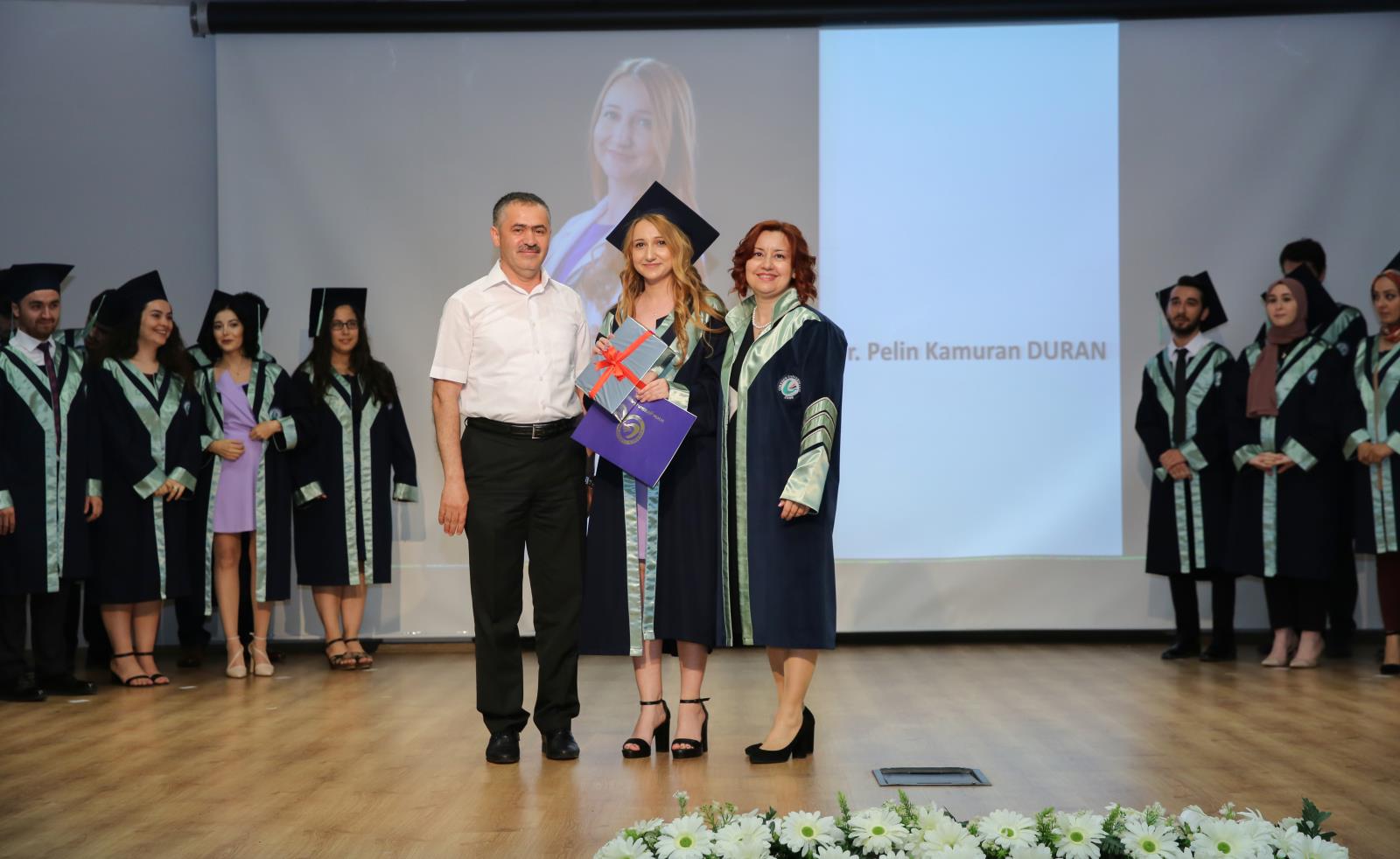 Fakülte birincisi Pelin Kamuran Duran'ın Prof. Dr. Canan Çelik eşliğinde mezuniyet kütüğüne plaket çakmasının ardından, mezun öğrenciler kep atma töreninde arkadaşları ve aileleriyle mezuniyet coşkusunu yaşadılar.