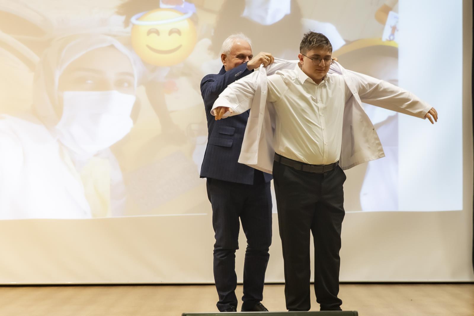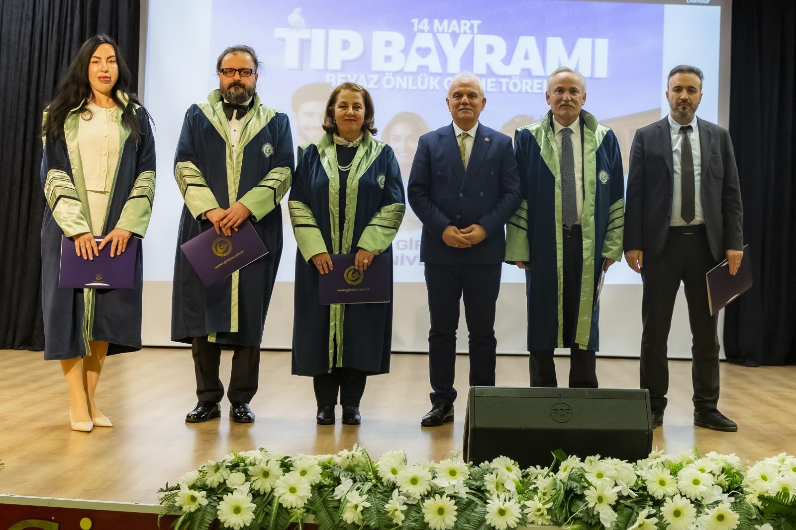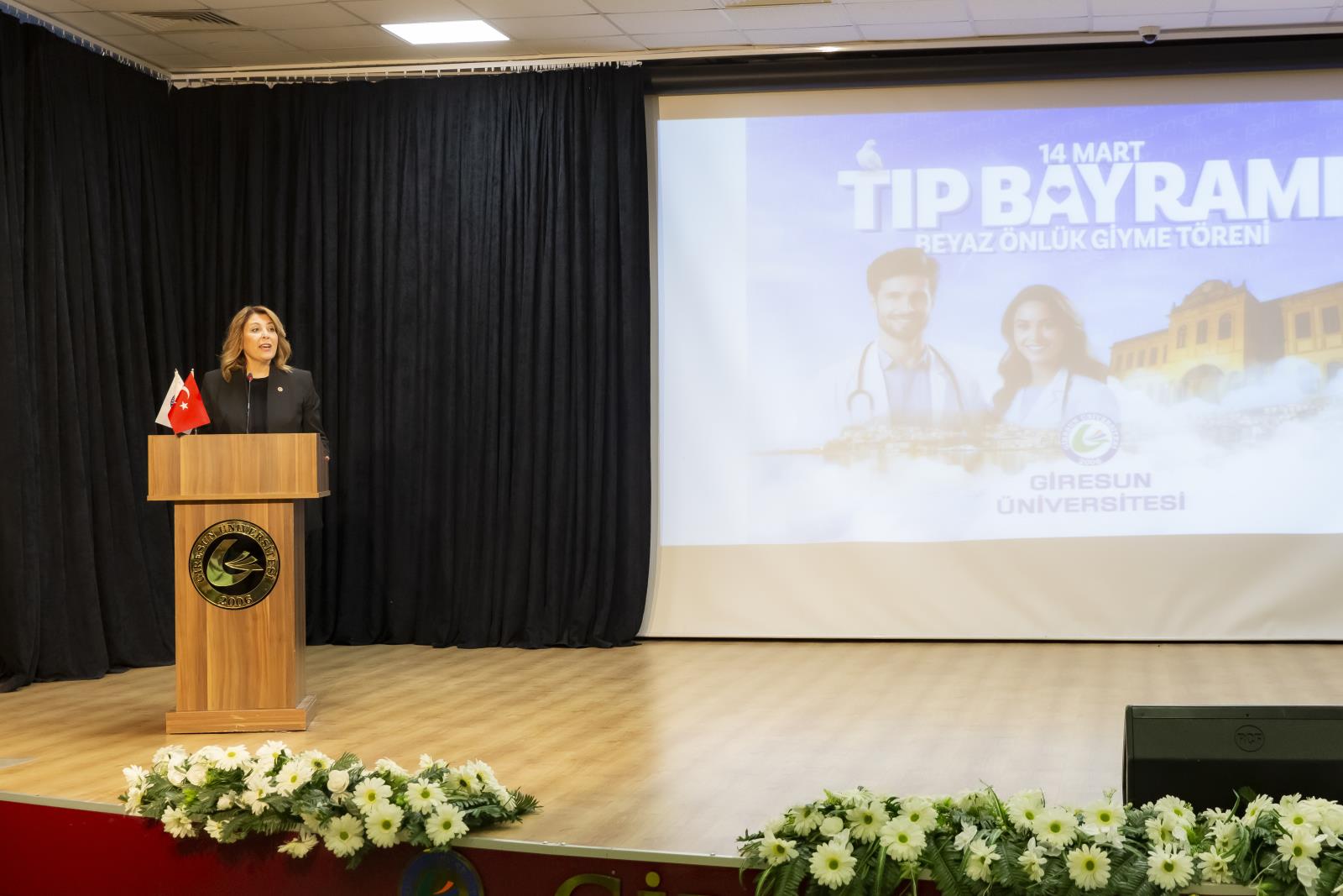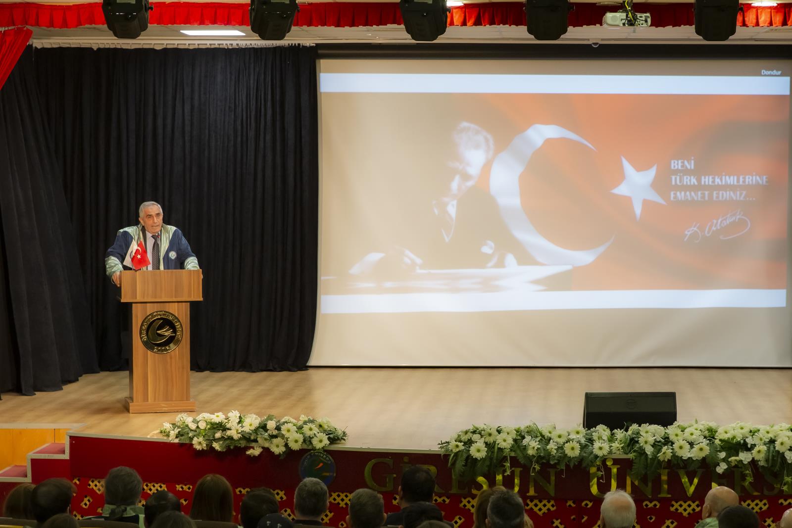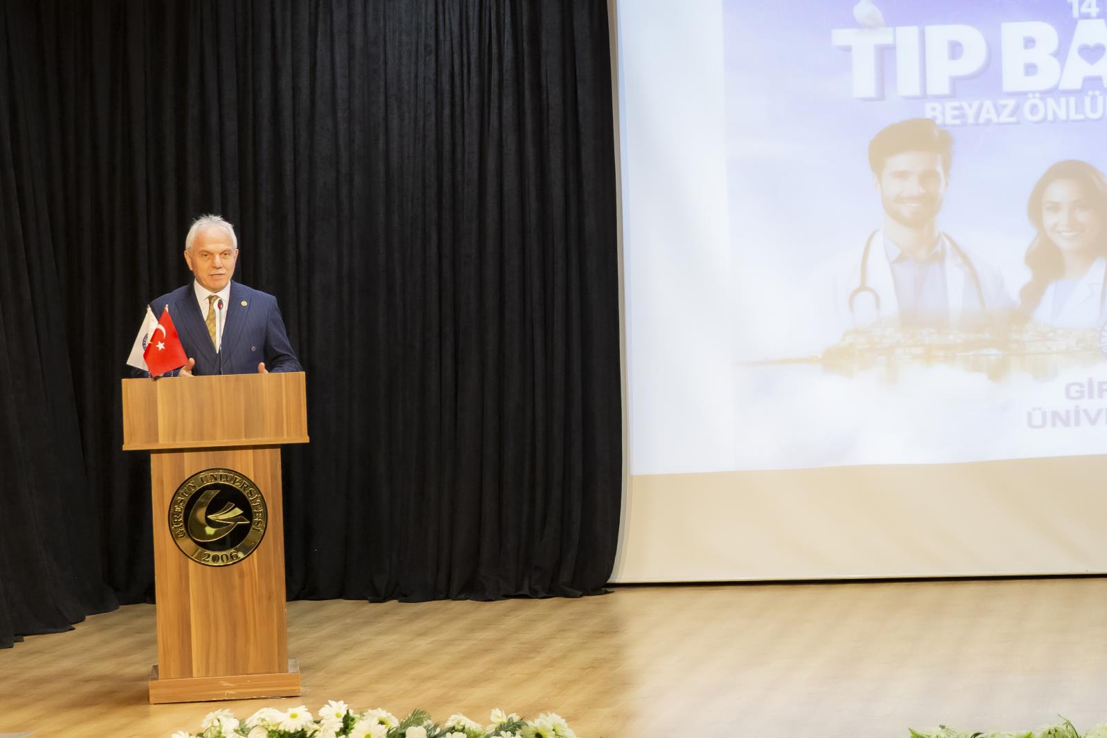 Programın açış konuşmasını yapan Tıp Fakültesi Dekanı Prof. Dr. Erdal AĞAR, salonunu dolduran sağlıkçıların “14 Mart Tıp Bayramı”nı kutlayarak sözlerine başladı. GRÜ Tıp Fakültesi hakkında genel bilgiler veren Sayın AĞAR sözlerini şu şekilde sürdürdü: “…14 Mart 1827’de İstanbul’da modern tıp eğitiminin temelleri atıldığında, bu topraklarda yalnızca bir mesleğin disiplini değil, aynı zamanda bir ülkü, vicdan, sorumluluk sahibi olmanın da temelleri atıldı. O günden günümüze kadar, özellikle de milli mücadele yıllarında tıbbiyeliler tüm dünyaya hekimliğin yalnızca bir meslek olmadığını en güzel örnekleriyle göstermişlerdir. Bugün sizler, geçmişten gelen bu değerli mirasın sembolü olan beyaz önlüğü giyerek mirası geleceğe taşıma yükümlülüğünü almış olacaksınız. … Sevgili gençler, tüm dünyada yaşanan ilkesizlik, haysiyetsizlik, gaddarlık ve insanlıktan nasibini almamışlık haline inat bizler daha çok ilkeli, daha fazla haysiyetli, daha merhametli, daha fazla insan olmak zorundayız. Bizler İnsanlığın umudu olmak zorundayız. Sizler mesleğinizi icra ederken bunu tüm insanlığa gösterebilirsiniz. Biliniz ki insanlığın yüksek değerleri olmadan ortaya koyacağınız meslek uygulamalarınızın etkisi oldukça sınırlı olacaktır… Zorlu eğitim ve öğretim hayatınızda başarılar dilerim. 14 Mart tıp bayramınızı tekrar tebrik eder, saygılar sunarım.”