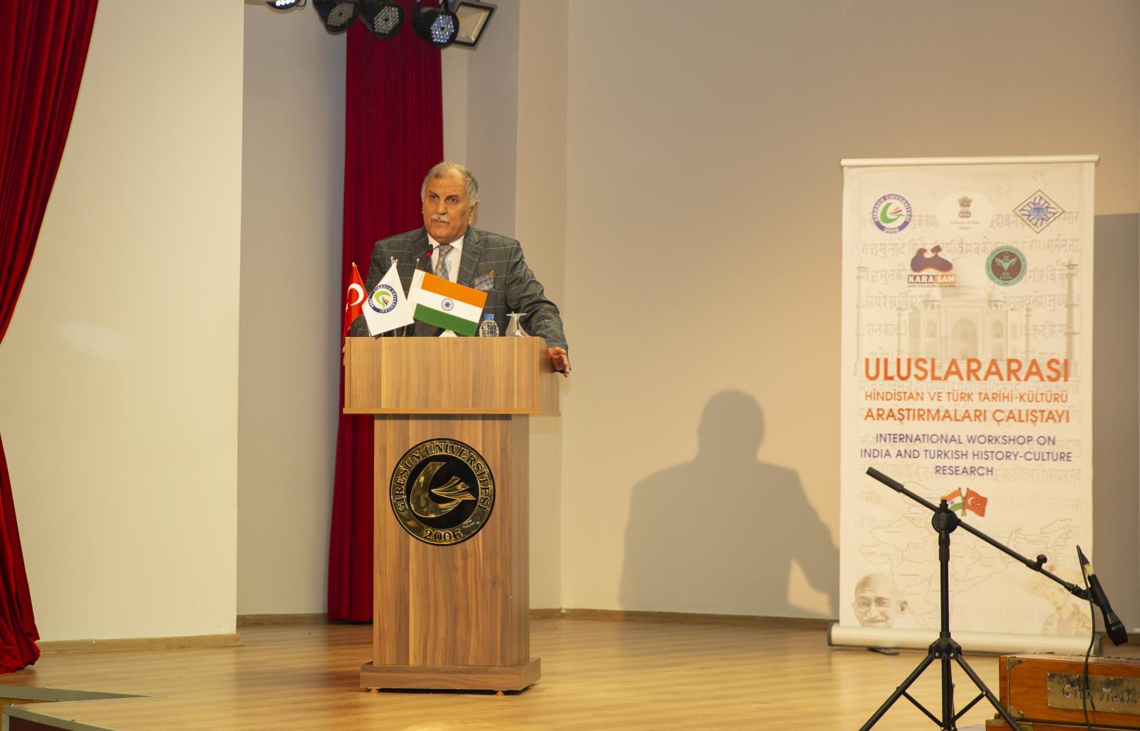 Konuşmanın ardından Rektörümüz Prof. Dr. Cevdet Coşkun kürsüdeki yerini aldı. Hint dinlerine, Hint bilimine, mistisizmine ve felsefelerine ilgi duyduğunu ve böyle bir etkinliğin üniversitemizde yapılmasından büyük mutluluk duyduğumu ifade eden Rektörümüz, şunları kaydetti: “Türkiye ve Hindistan aynı kaderi yaşayan ve aynı sonda buluşan iki ülkedir. Türkiye Cumhuriyetinin 20.asrın başlarında verdiği bağımsızlık mücadelesi sonrası devletler sahnesinde yer alması, tarihin oldukça önemli gelişmelerinden biridir. Yine Hindistan’ın ise İkinci Dünya Savaşı’nı takiben varlığını ortaya koyması ve bağımsız olarak devletler sahnesine çıkması da Asya kıtasının tarihsel dönüşümü bağlamında kayda değer hadiselerindendir. Burada şunu belirtmek gerekir ki milli mücadele dönemimizde bize, dünya çapında maddi-manevi anlamda en büyük katkıyı dönemin Hindistan’ı sağlamıştır. Bundan dolayı Hindistan halkına bir kez daha şükranlarımızı sunuyoruz. Konum itibariyle Türkiye Asya kıtasının Batı; Hindistan ise Güney kapısı olarak doğu ve batı dünyaları arasında birer geçiş mevkileridir. Tarihin her döneminde birbirlerini yakından izlediğinden kuşkumuz olmayan bu iki güçlü kardeş ülke dokudukları ortak bağla yakın ilişkilerini geleceğe de taşıyacaklardır. Etkinliğin başarılı geçmesini temenni ediyor, katılımınız için hepinize şükranlarımı sunuyorum” dedi.