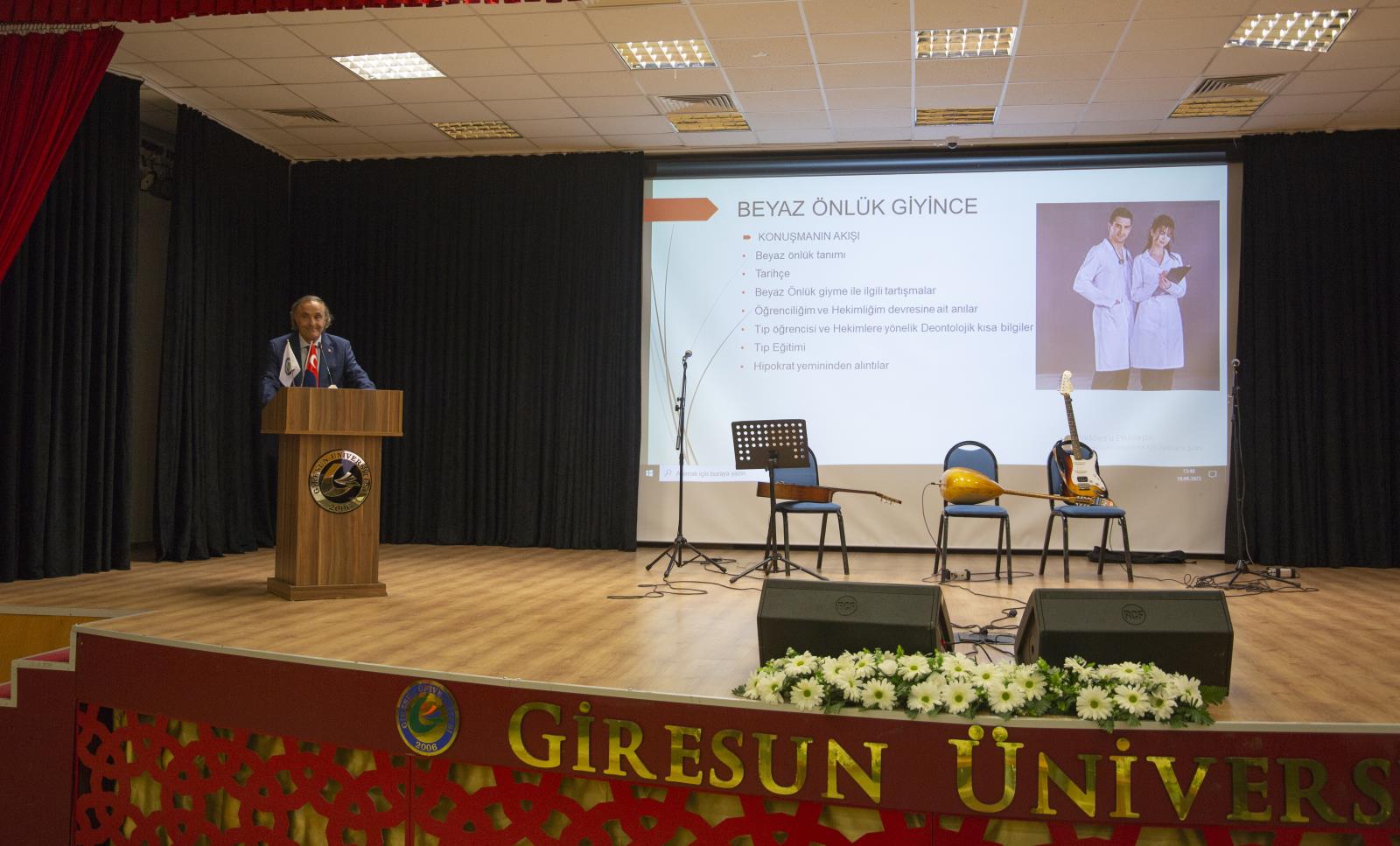 Sonrasında iki yıldır Tıp Fakültemizde derslere giren Karadeniz Teknik Üniversitesi Çocuk Sağlığı ve Hastalıkları Ana Bilim Dalı emekli öğretim üyesi Prof. Dr. Ali Baki “Beyaz Önlük Giyince” başlıklı bir konuşma gerçekleştirdi. Prof. Dr. Baki, konuşmasında beyaz önlüğün tanımından, nasıl başladığına, anlam ve önemine değindikten sonra mesleki deneyimlerinden ve anılarından bahsederek doktorluk mesleğinin hayat boyu öğrenme ve yenilenme gerektiren bir yapıda olduğunu ve bir meslekten çok bir yaşam şekli olduğunu vurguladı.