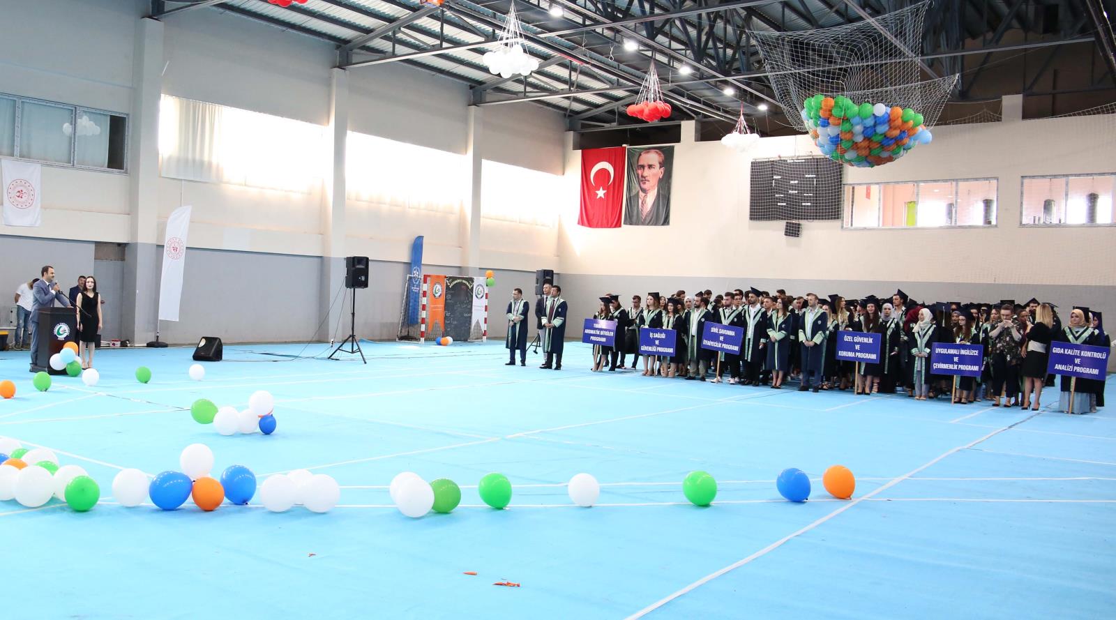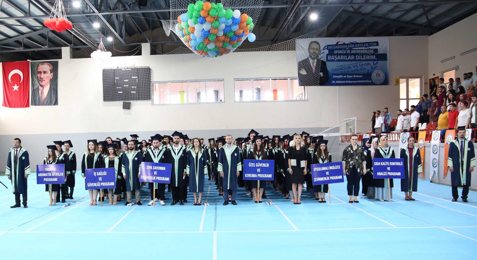 Okul birincisi Tolunay Ataman’ın mezun öğrenciler adına yaptığı konuşmasıyla başlayan program, Yüksekokul Müdürü Dr. Öğr. Üyesi İhsan Cora’nın konuşmalarıyla devam etti.