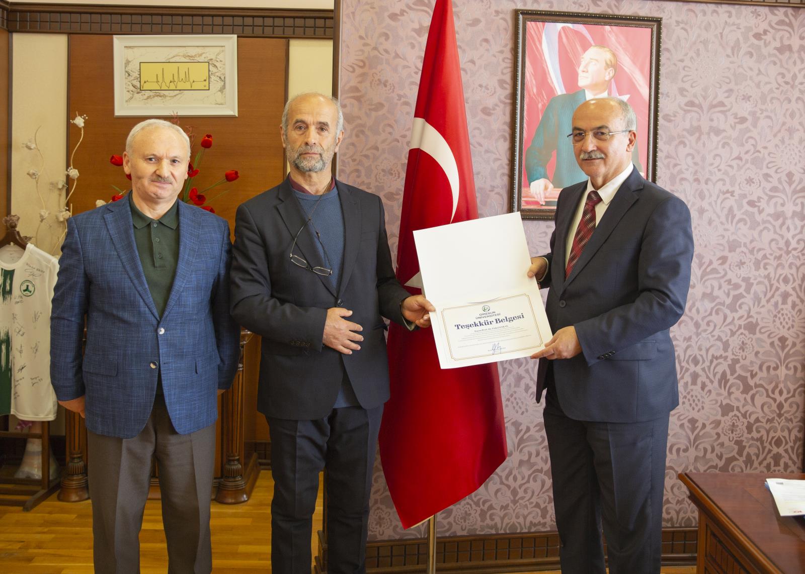 Bu anlamlı davranışı sebebiyle Sayın Fahri SAKAL'ı makamında kabul eden Rektörümüz Prof. Dr. Yılmaz CAN, kendisine teşekkür etti. Üniversite kütüphanesinin bu anlamlı bağışlarla daha da zenginleştiğini dile getiren Rektörümüz, günün anısına hazırlanan teşekkür belgesini Sayın SAKAL'a, takdim etti.