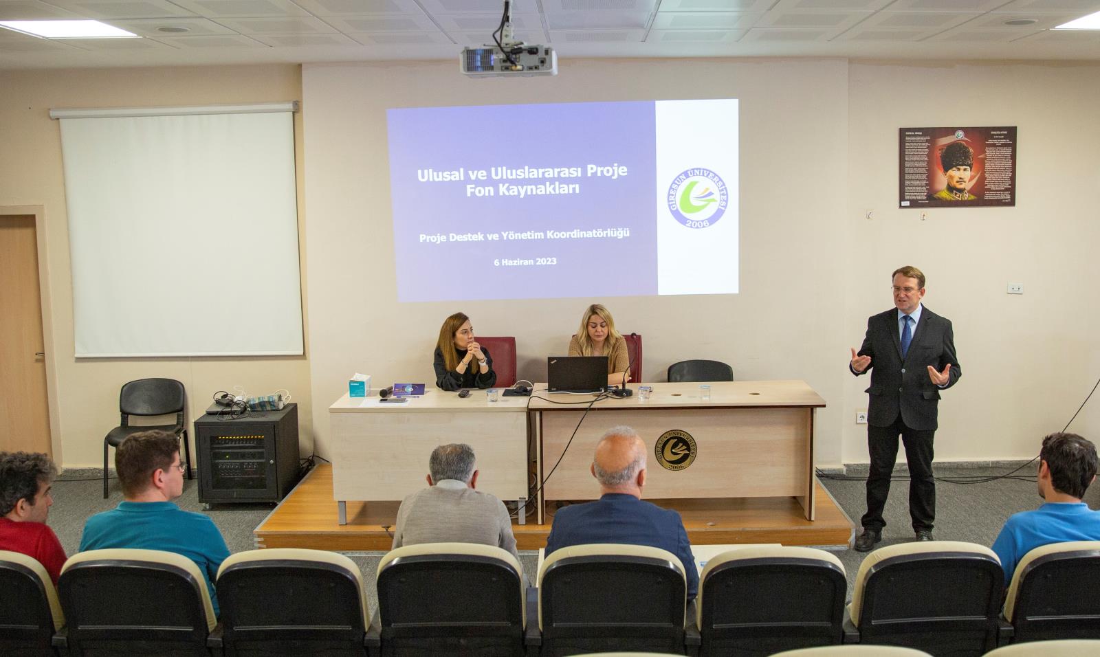 Tanıtım toplantısında ilk olarak İktisadi ve İdari Bilimler Fakültesi Dekanı ve aynı zamanda Proje Destek ve Yönetim Koordinatörü olan Prof. Dr. Kurtuluş Yılmaz Genç söz alarak Proje Destek ve Yönetim Koordinatörlüğü’nden ve çalışmalarından bahsetti. Ardından Öğr. Gör. Burcu Akkaya ile Öğr. Gör. Ayben Gül ulusal ve uluslararası destekler ve hibe çağrılarına yönelik bir bilgilendirme sunumu gerçekleştirdiler.