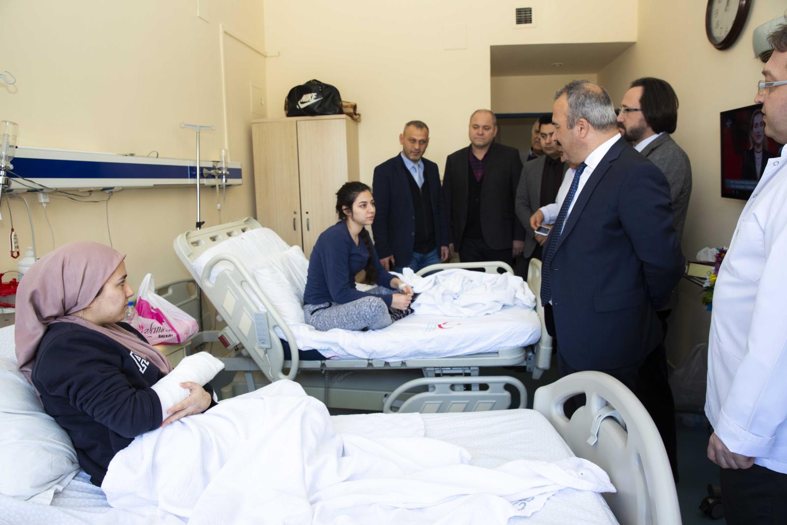Rektör Yrd. Prof. Dr. Mustafa Cin, Rektör Danışmanları Dr. Öğr. Üyesi Abbas Karaağaçlı, Dr. Öğr. Üyesi Oktay Karaman ve Başhekim Doç. Dr. Kemal Uzun ile birlikte öğrencilerimizi ziyaret eden Prof. Dr. Cevdet Coşkun, doktorlardan öğrencilerin sağlık durumu hakkında bilgi aldı.