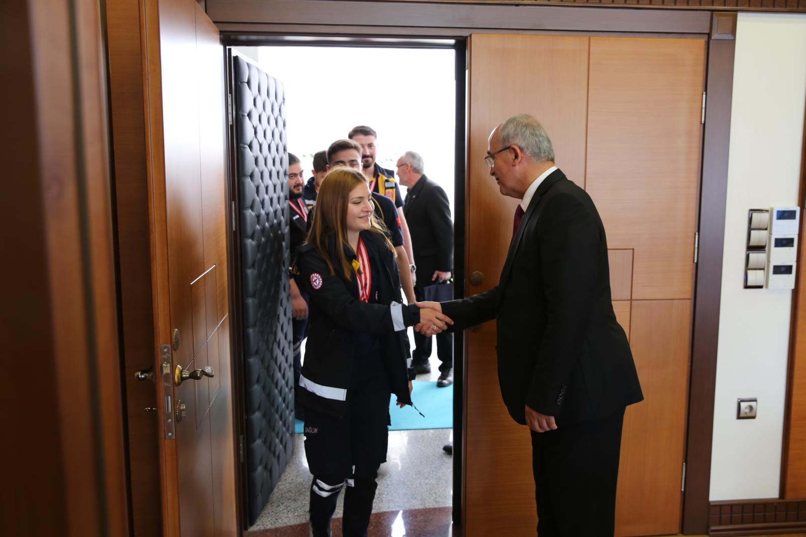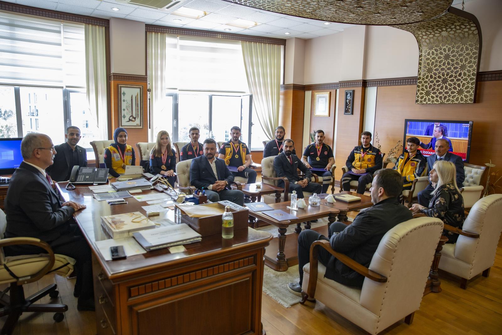 Yarışmada, toplamda 1 kupa ve 12 madalya kazanan öğrencilerimiz; Orhan ASILSOY, Meryem GÜNAYDIN, Melih Turap GÜNEŞ, İbrahim Etka GÜRBÜZ, Zuhal Yıldız OKÇU, Yusuf ÇİFTÇİ, Oğuzhan ÖZ ve Umut GENCER ile ekipleri bu yarışmaya hazırlayan hocaları; Dr. Öğr. Üyesi Aşkın TEKİN, Öğr. Gör. Olcay KARAOĞLU ve Öğr. Gör. Hakan ŞENTÜRK’ü makamında kabul eden Rektörümüz Prof. Dr. Yılmaz CAN, elde edilen başarıdan dolayı kendilerini tebrik etti.