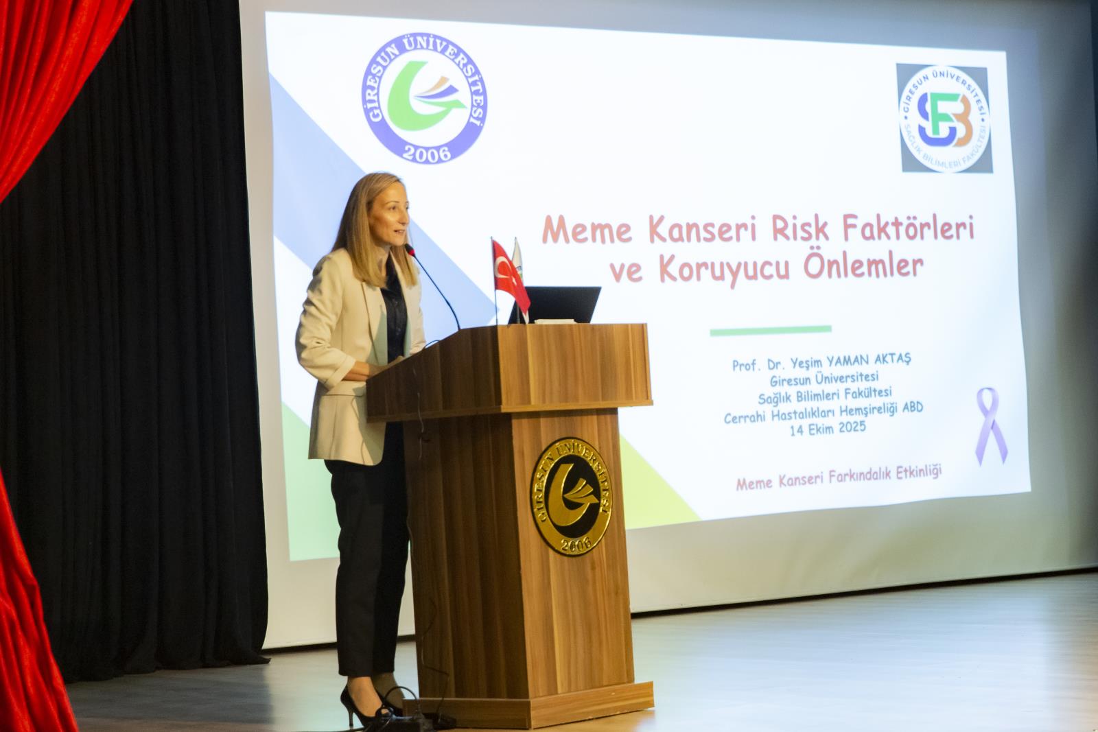 Ardından, Sağlık Bilimleri Fakültesi Cerrahi Hastalıkları Hemşireliği Anabilim Dalı öğretim üyesi Prof. Dr. Yeşim Yaman Aktaş, meme kanseri risk faktörlerini ve korunma yollarını anlatarak yaşam tarzı, obezite ve beslenme alışkanlıklarının hastalık gelişimindeki rolünü vurguladı.