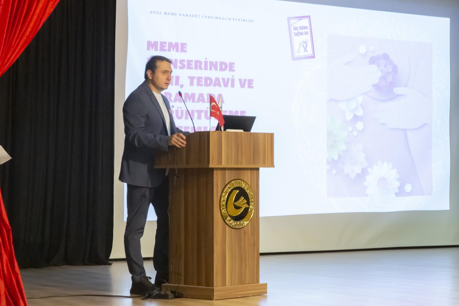 Sonrasında Tıp Fakültesi Genel Cerrahi Anabilim Dalı öğretim üyesi Doç. Dr. Tuğrul Kesicioğlu, meme muayenesi yöntemleri ve klinik uygulamaları üzerine bilgi paylaşarak, kadınların kendi meme yapısını tanımasının erken teşhis açısından önemini vurguladı.