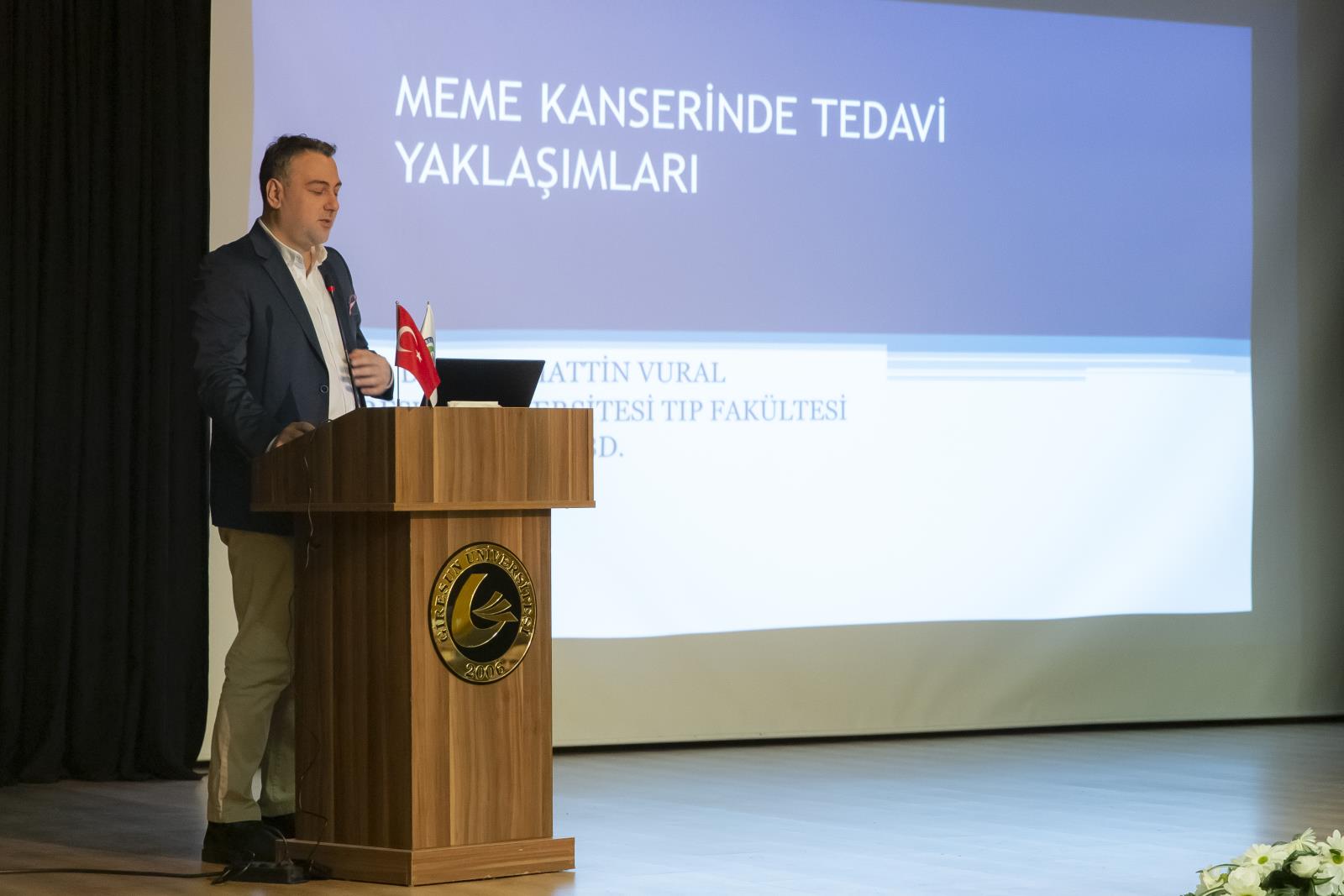 Üçüncü konuşmacı olarak Tıp Fakültesi Genel Cerrahi Anabilim Dalı öğretim üyesi Doç. Dr. İsmail Aydın, Türkiye’de yürütülen ulusal tarama programları, mamografi, klinik meme muayenesi (KMM) ve kendi kendine meme muayenesi (KKMM) uygulamaları hakkında bilgiler sundu.