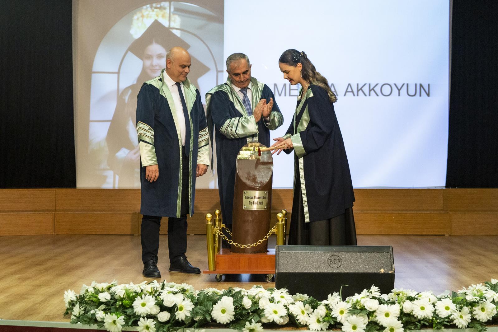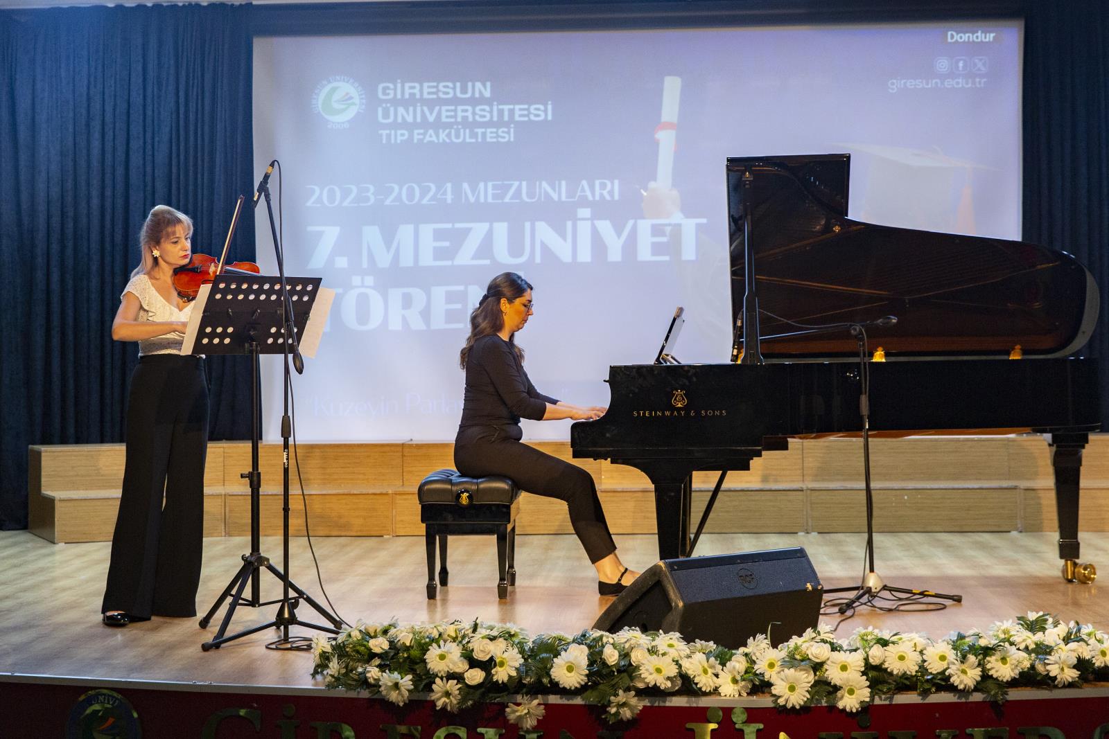 Ardından Üniversitemiz Devlet Konservatuarı öğretim üyeleri Dr. Öğr. Üyesi Betül Yetkin Gülmez ve Öğr. Gör. Begüm Sarısözen’in hazırladığı müzik dinletisi ile devam eden törende mezuniyet törenine katkı sunan kuruluşlara ve hazırlığında emeği geçen öğretim üyelerine teşekkür belgeleri verildi.