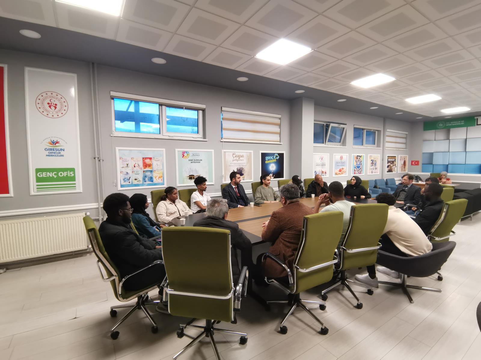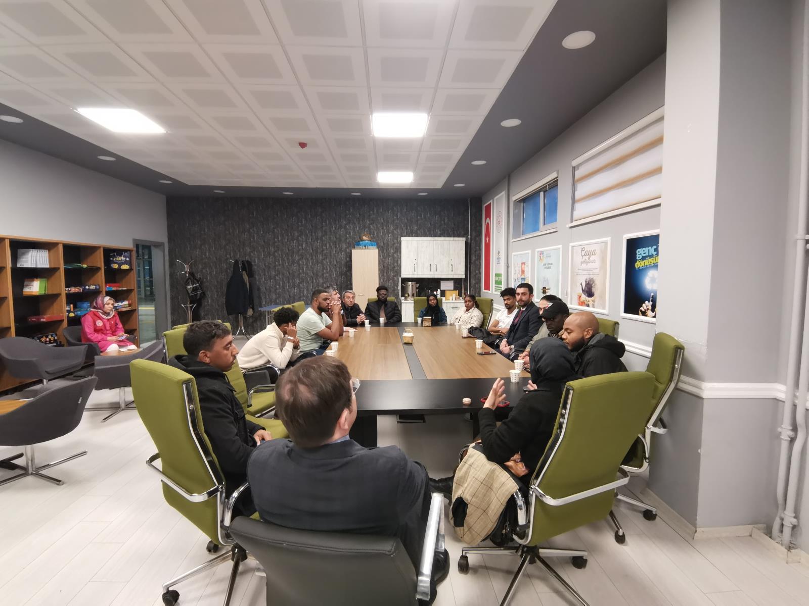 Türkiye Maarif Vakfı Yönetim Kurulu Üyesi Dr. Halime KÖKCE, Maarif Ajans Daire Başkanı Hamza ÖZDEMİR, Mezun Öğrenci İşleri Daire Başkanı Ahmet GÜNEY ve Mezun Öğrenci Sorumlu Muhammed KURT’tan oluşan heyet ilk olarak GRÜ Uluslararası Öğrenci Ofisi Koordinatörü Öğr. Gör. Abdullah DEMİR ile bir araya geldi.