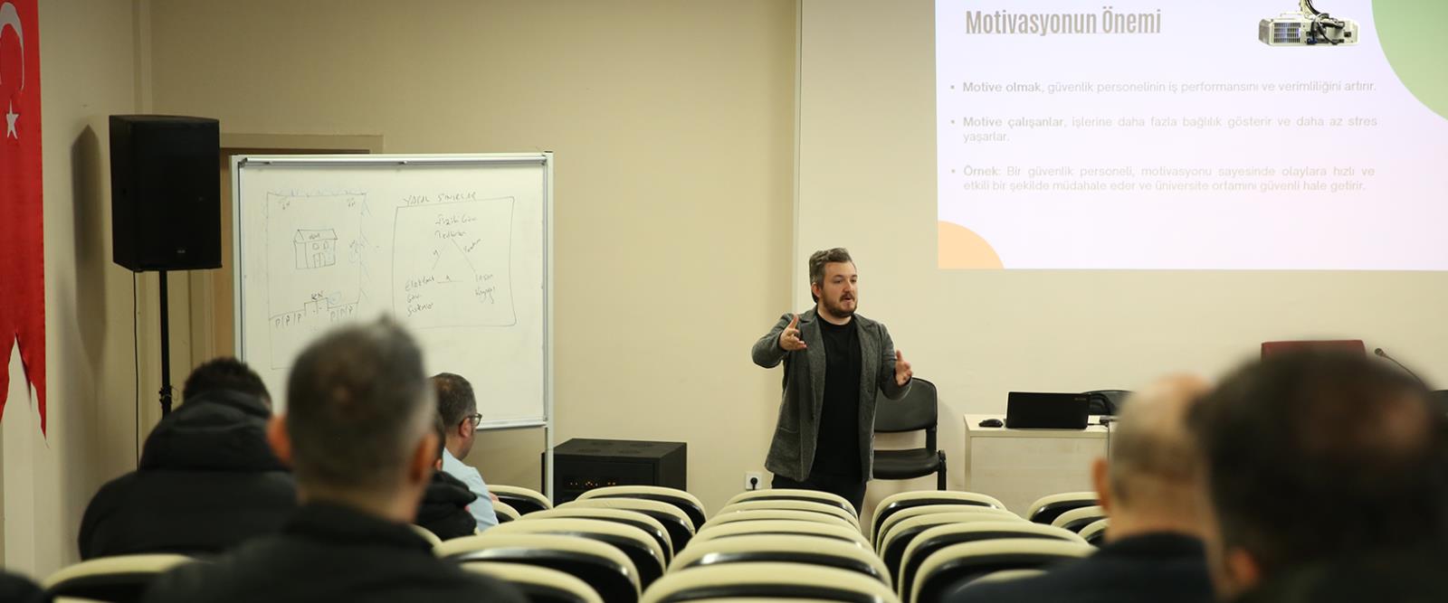 Üniversitemizin Güre Yerleşkesinde düzenlenen eğitimlerde; İktisadi ve İdari Bilimler Fakültesi Dekanı Prof. Dr. Kurtuluş Yılmaz GENÇ “Liderlik Eğitimi”, İktisadi ve İdari Bilimler Fakültesinden Doç. Dr. Yasemin MAMUR IŞIKÇI “Demokrasi ve İnsan Hakları”, Dr. Öğr. Üyesi Hakan SİPAHİ “Motivasyon”, Dr. Öğr. Üyesi Harun DUMLU “Halkla İlişkiler”, Dr. Öğr. Üyesi Cevdet ÖZMEN ve GRÜ Genel Sekreter Yrd. Hüseyin ÖZDEMİR, “Görgü ve Nezaket Kuralları/Protokol Kuralları”, Tirebolu İletişim Fakültesinden Dr. Öğr. Üyesi Cem FERİDUNOĞLU “Etkili İletişim/Telefonla Etkili İletişim” ve Espiye MYO’dan Öğr. Gör. Latif Onur KOŞU “Güvenlik Hizmetlerinde Profesyonellik Anlayışı” konularında sunum yaptılar.
