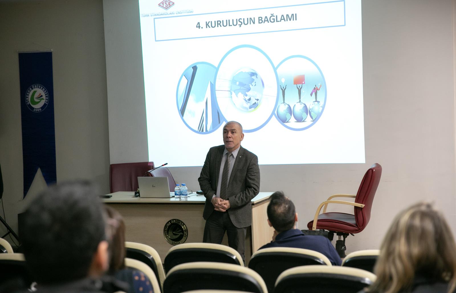 Rektörümüz, Türk Standartları Enstitüsü ile yürütülen bu sürecin henüz başlangıç aşamasında olduğuna değinerek, kısa sürede önemli mesafeler kat edebilmek için tüm paydaşların konuya azami özen ve hassasiyet göstermesinin büyük önem taşıdığını vurguladı. Prof. Dr. Yılmaz Can, Akreditasyon, Akademik Değerlendirme ve Kalite Koordinatörlüğü çalışmalarıyla ivme kazanan bu sürecin, söz konusu eğitimlerle birlikte daha güçlü ve sürdürülebilir bir yapıya kavuştuğunu belirtti.